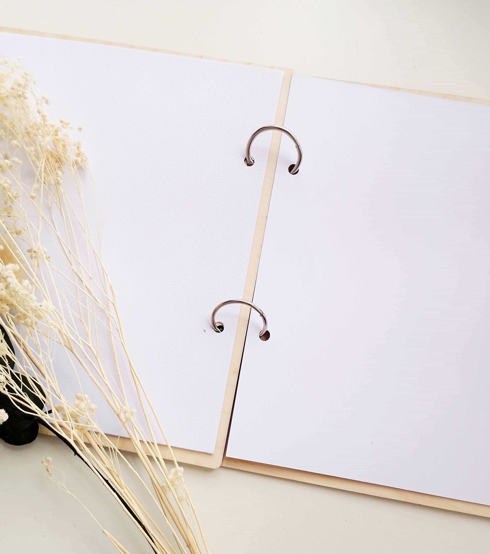 El álbum incluye 20 hojas de color marrón kraft o blanco de tamaño A4 y 300 gr de grosor. En las opciones puedes indicar si quieres añadir hojas extra.
