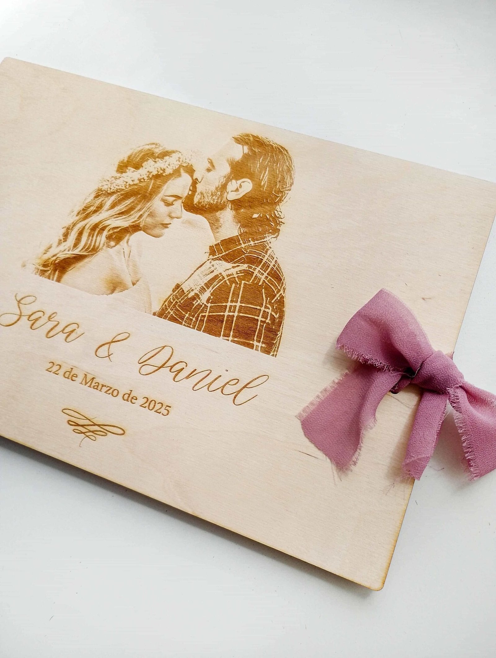 Álbum de fotos personalizado / Libro de firmas con la portada en madera y foto grabada