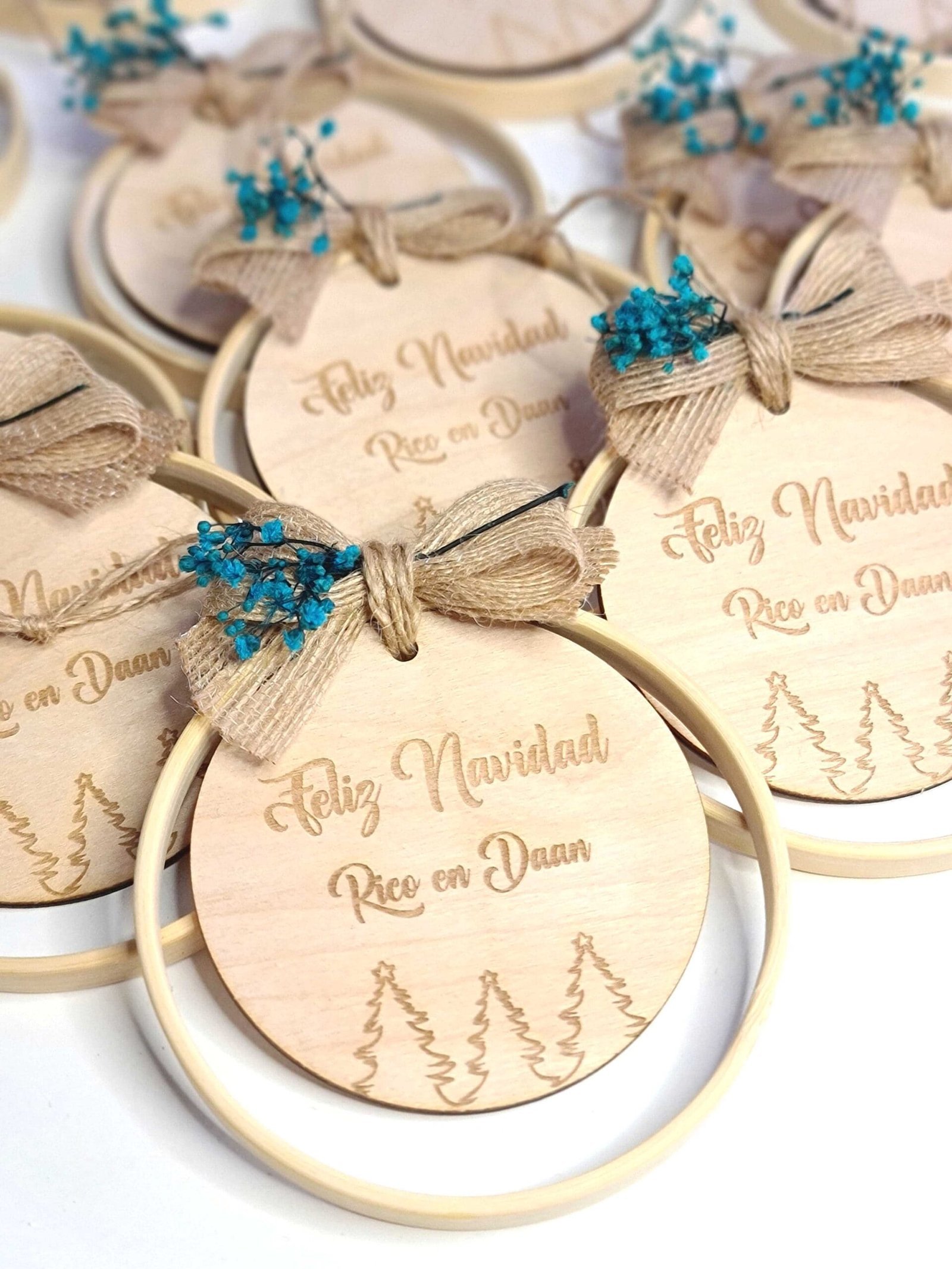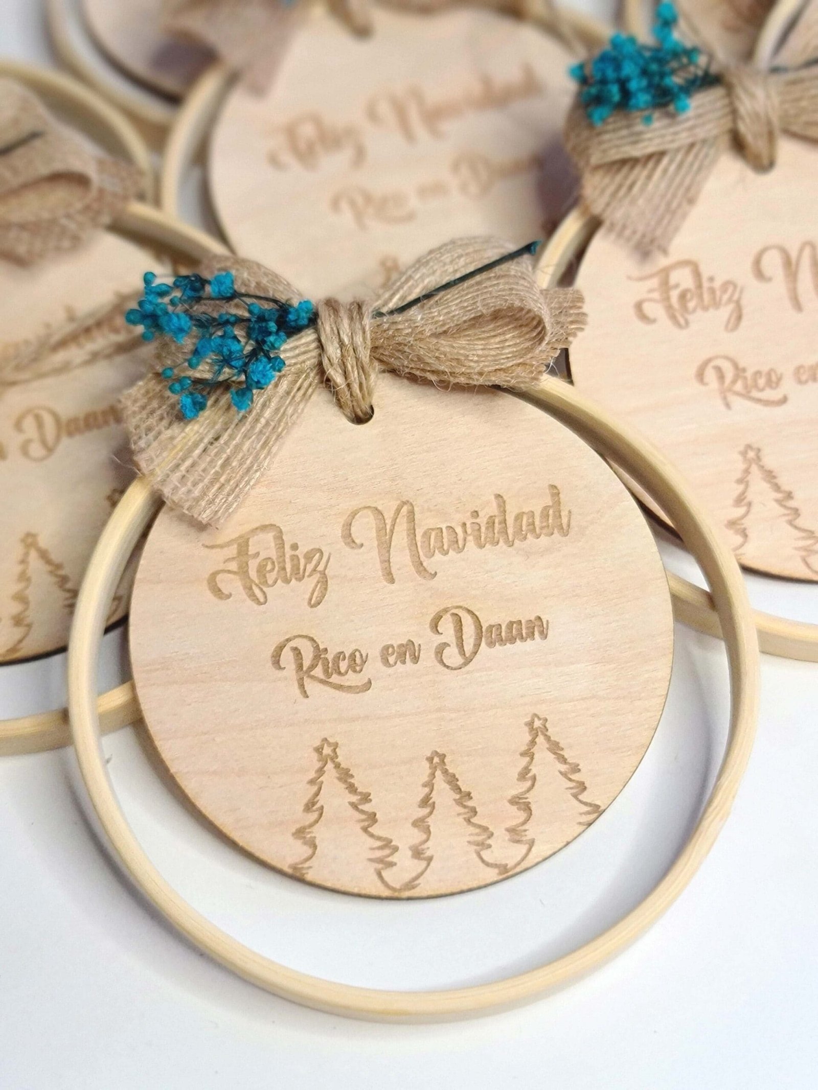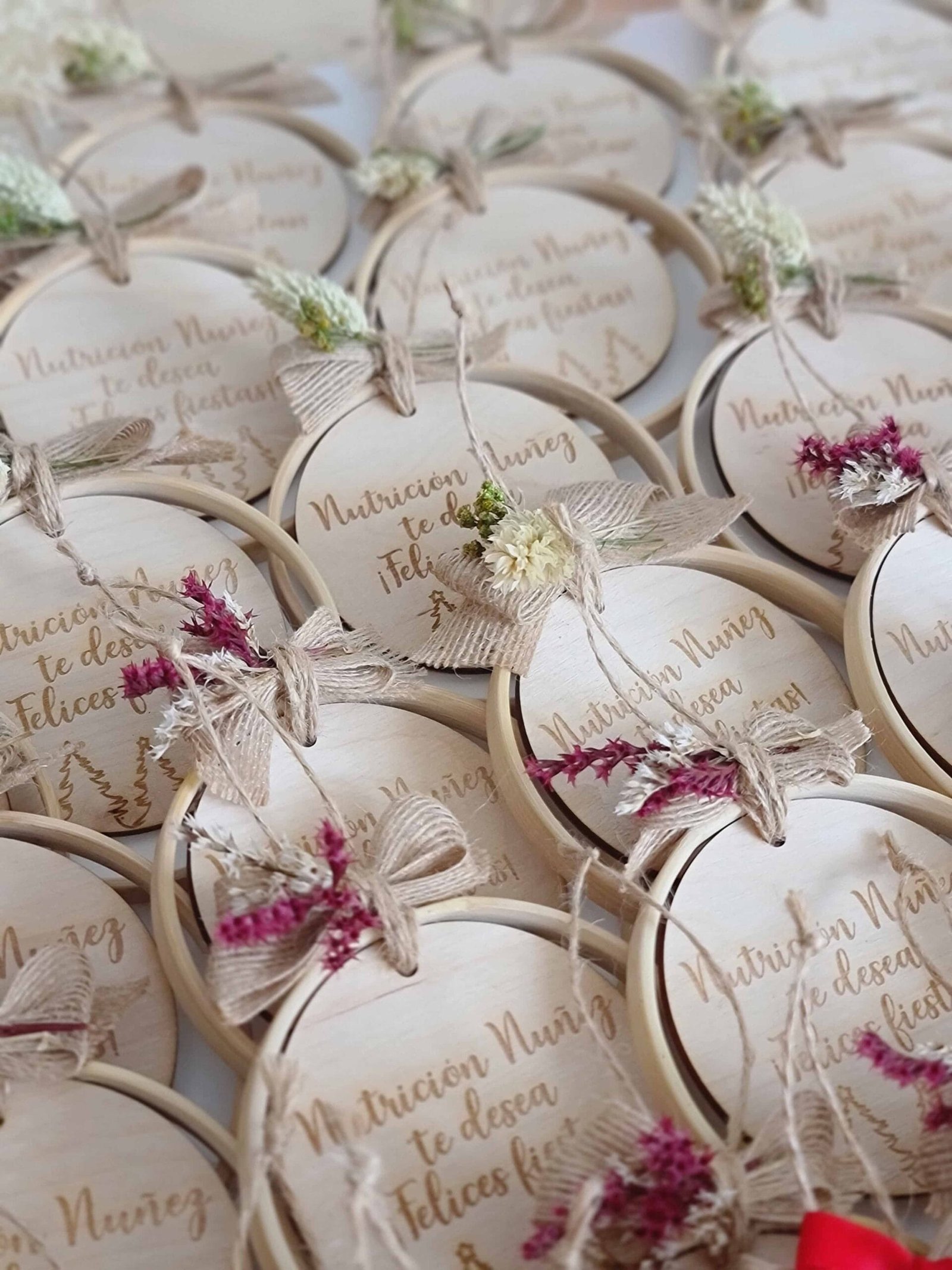 Cada adorno está elaborado a mano con bambú de alta calidad, madera personalizada y flores preservadas cuidadosamente seleccionadas, para ofrecerte un diseño exclusivo que refleje tu estilo y dure año tras año.