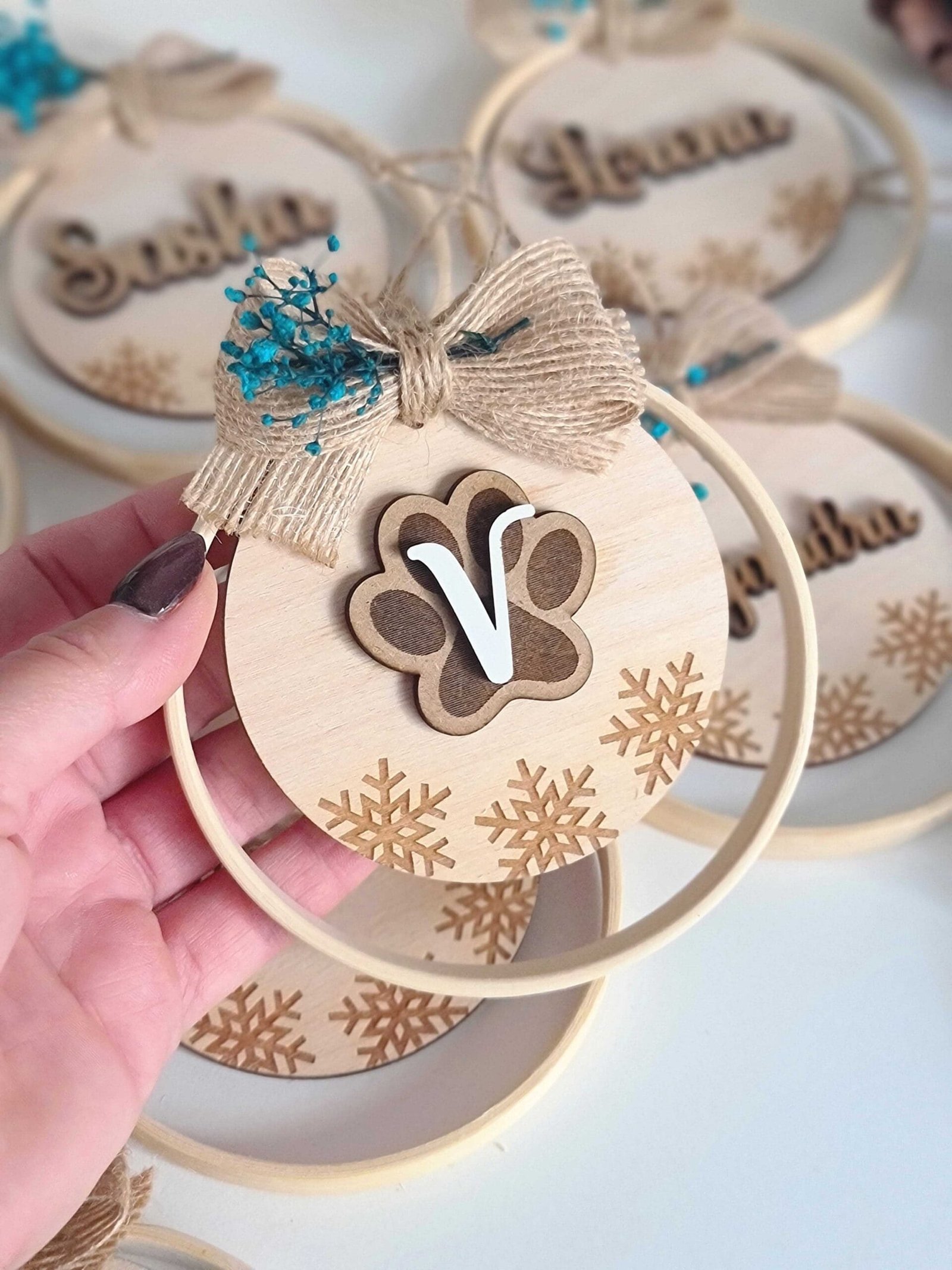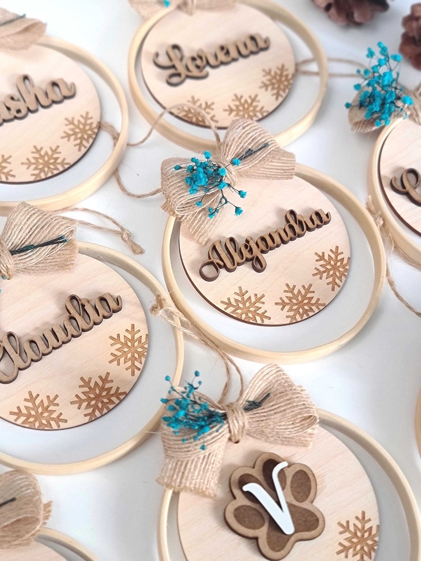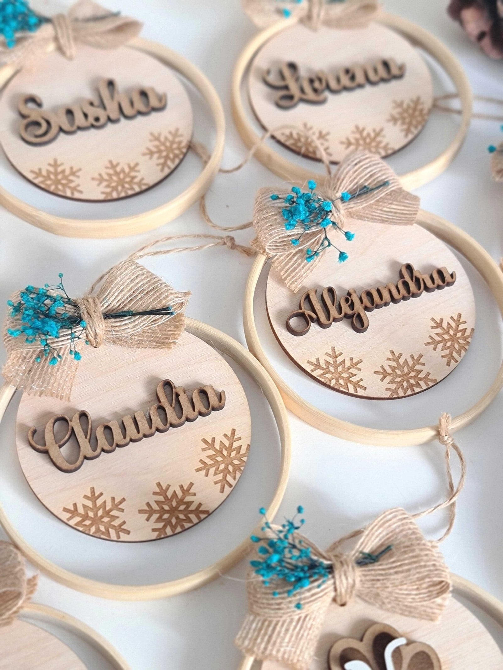 Cada adorno está elaborado a mano con bambú de alta calidad, madera personalizada y flores preservadas cuidadosamente seleccionadas, para ofrecerte un diseño exclusivo que refleje tu estilo y dure año tras año.