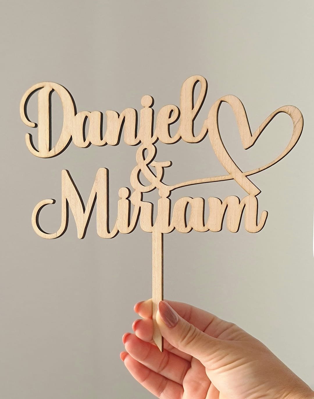 Nuestro topper de madera natural es la pieza central perfecta para tu tarta de boda. Personalizado con los nombres de los novios y un corazón de madera que simboliza vuestro amor, este adorno añadirá un toque único y especial a vuestra celebración. La madera natural aporta calidez y autenticidad, convirtiéndolo en un recuerdo duradero de vuestro gran día. Materiales: Madera contrachapada natural de 3mm de grosor Medidas: 15 - 20 cm de ancho y 20 cm de alto aprox. (el tamaño exacto dependerá de los nombres de los novios) Diseñado y fabricado con mucho mimo por nosotros en nuestro taller en Alicante, España. Envíos a toda Europa. Consulta el precio de tu envío en el carrito de compra.