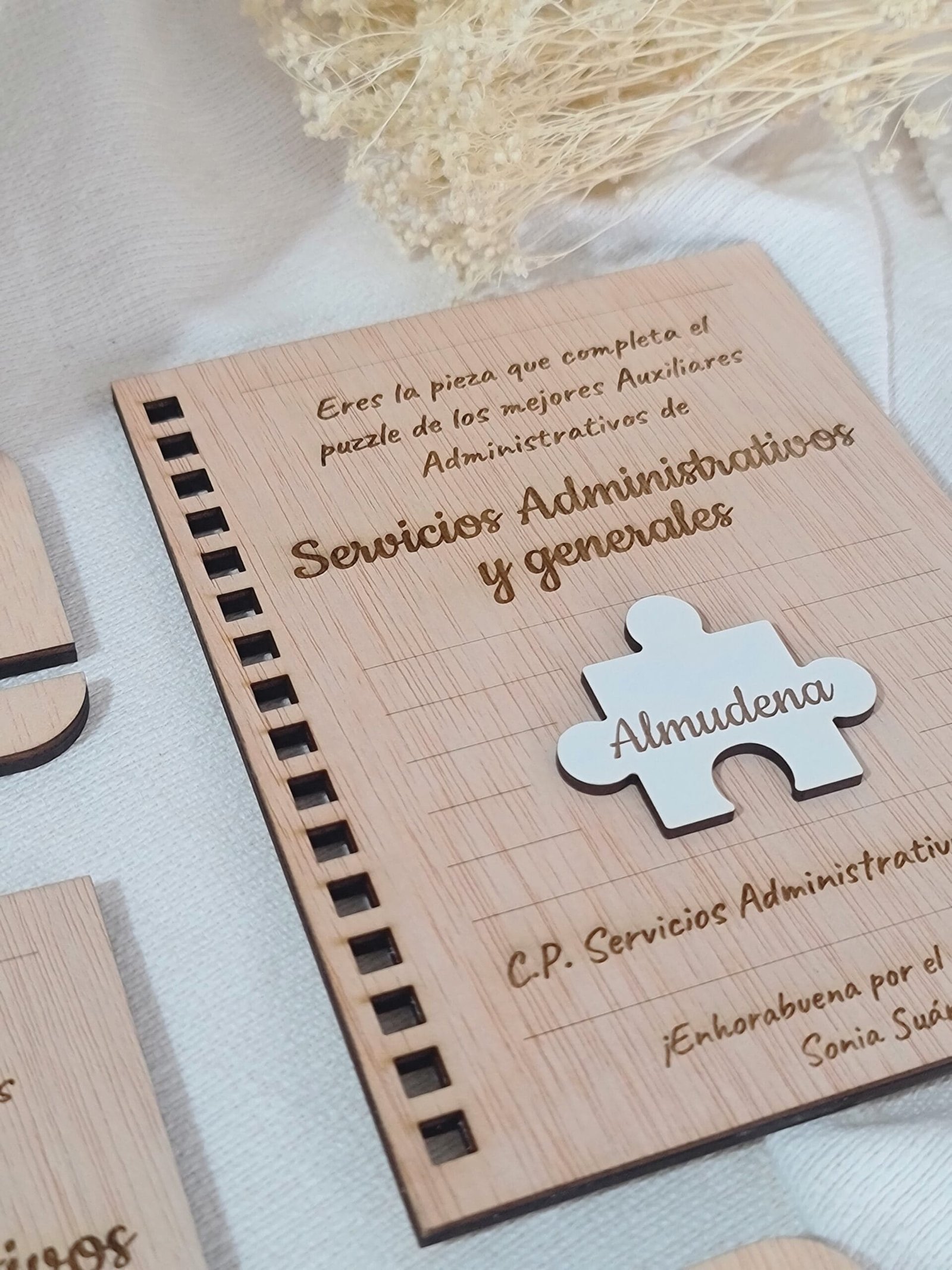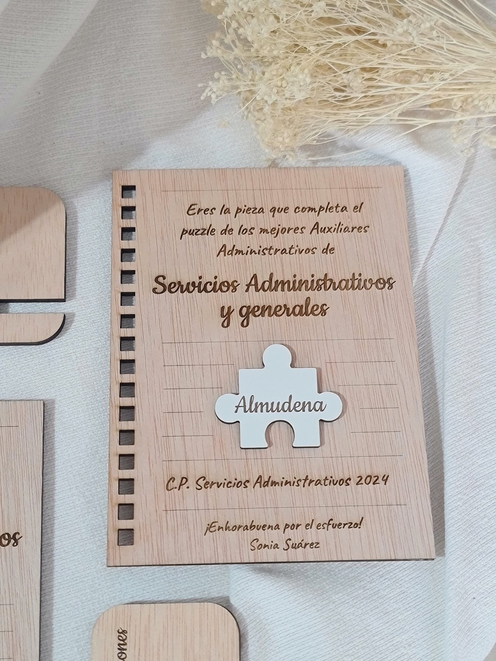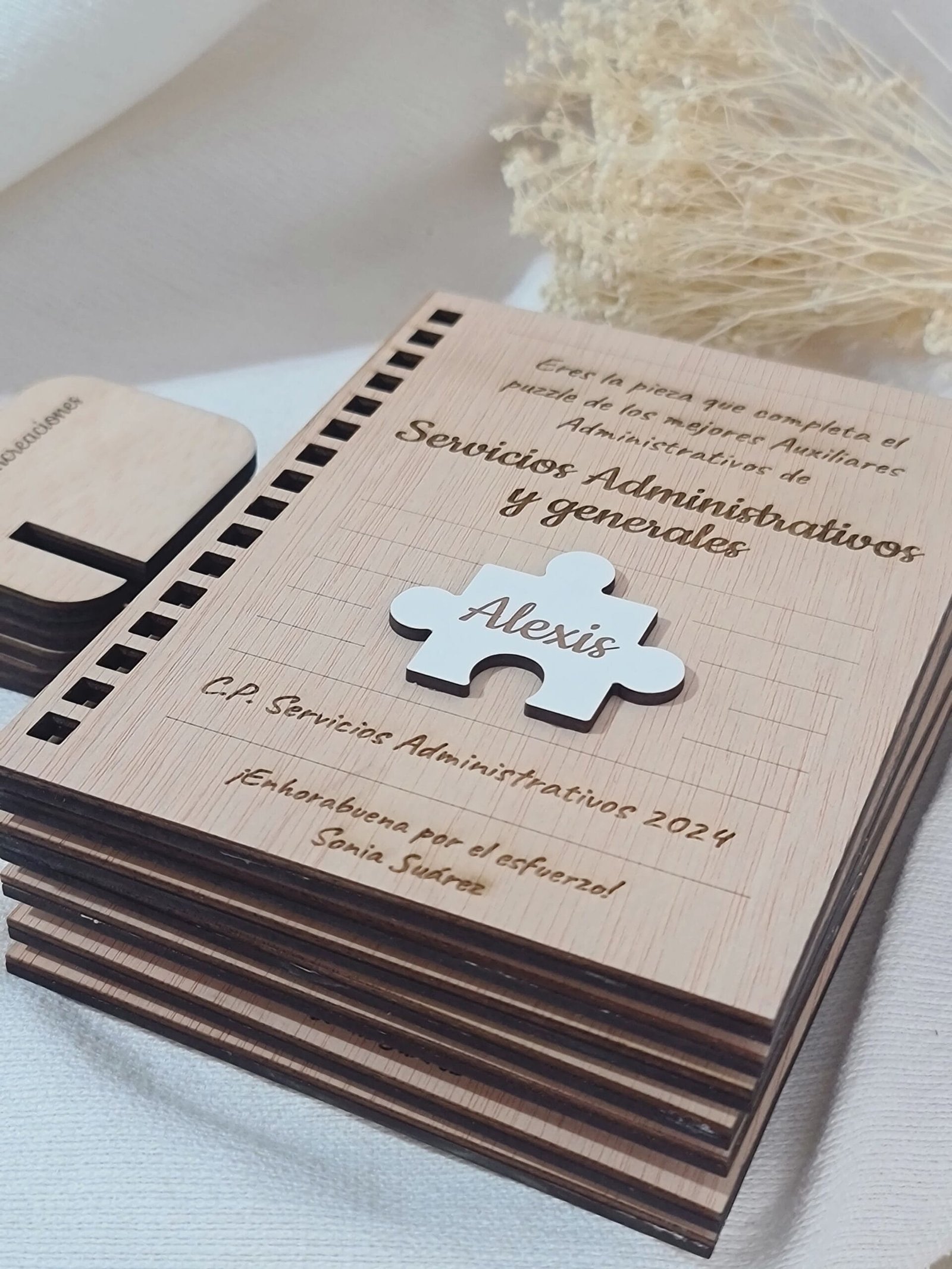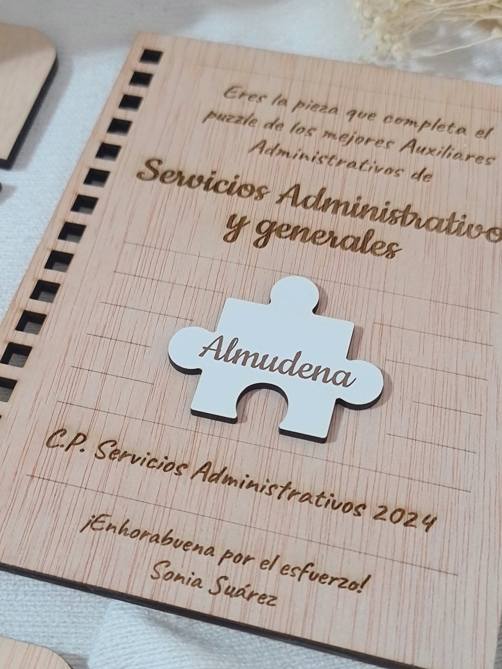 Celebra los logros de tus alumnos con nuestro certificado en madera, diseñado en forma de hoja de cuaderno. Ideal para estudiantes de formación profesional en administración, este diploma personalizable incluye el nombre del alumno y el curso completado. Un regalo elegante y duradero que reconoce su esfuerzo y les inspira a seguir adelante en su carrera.