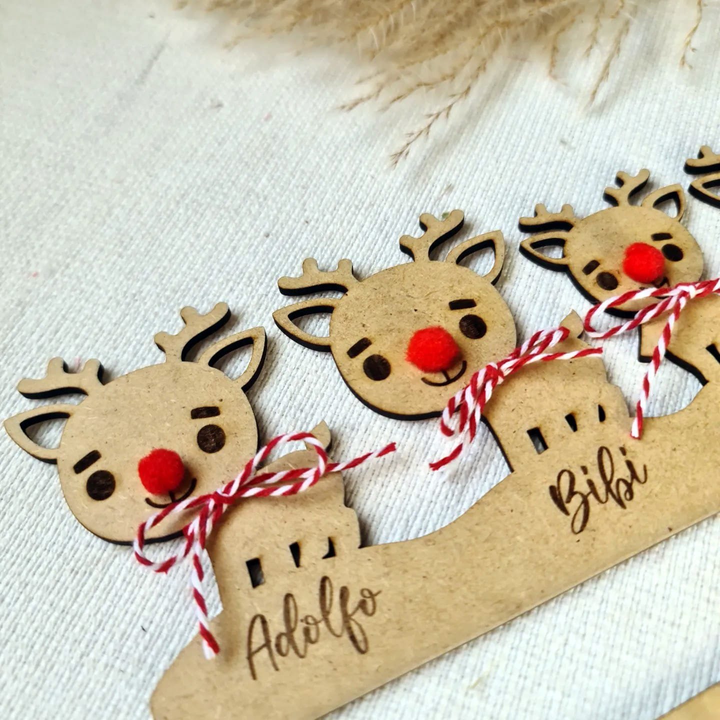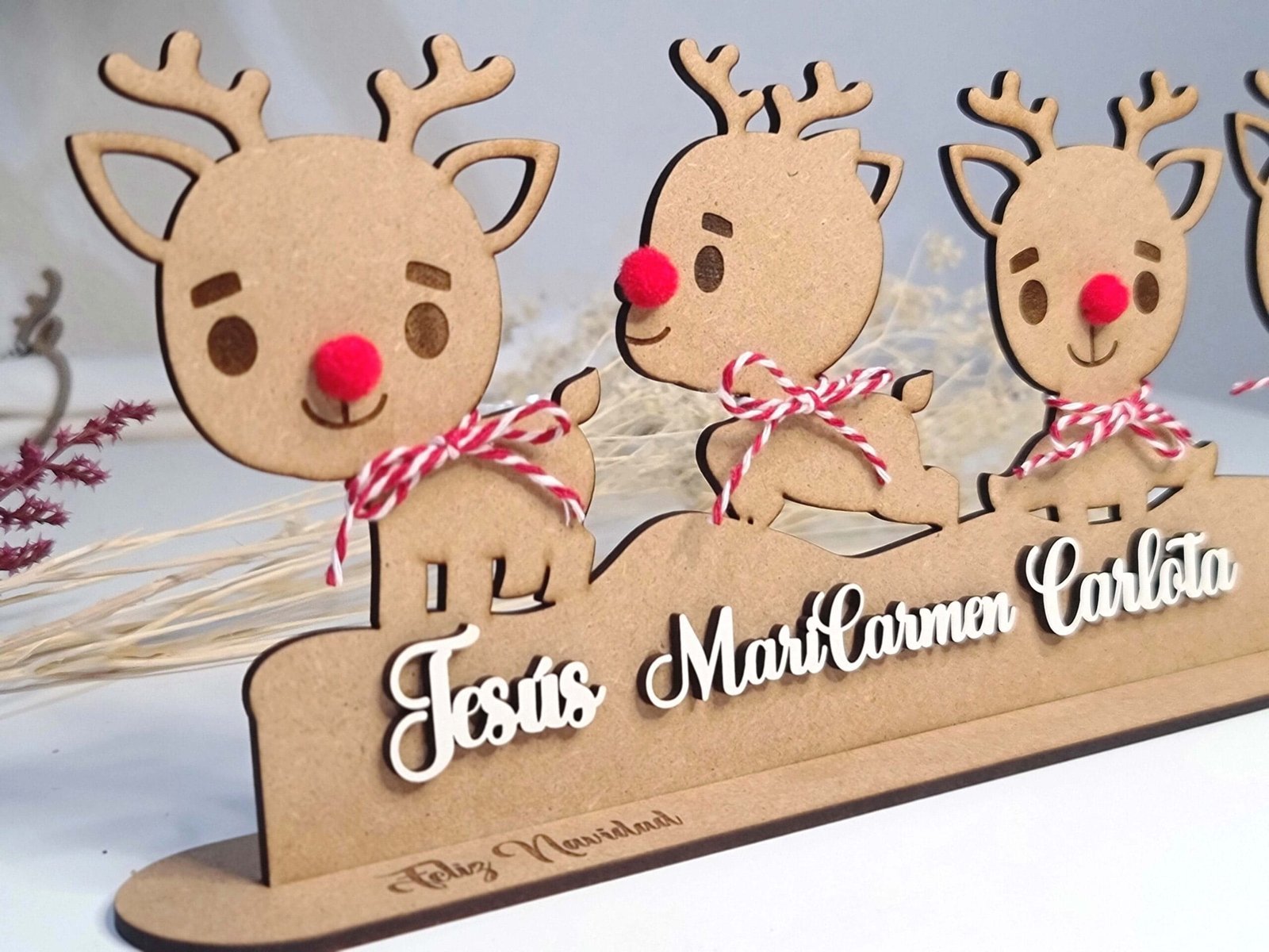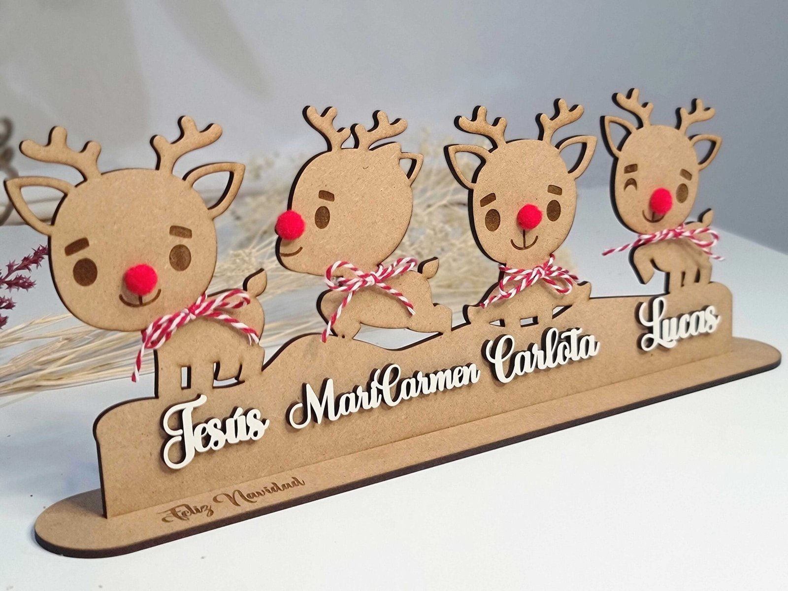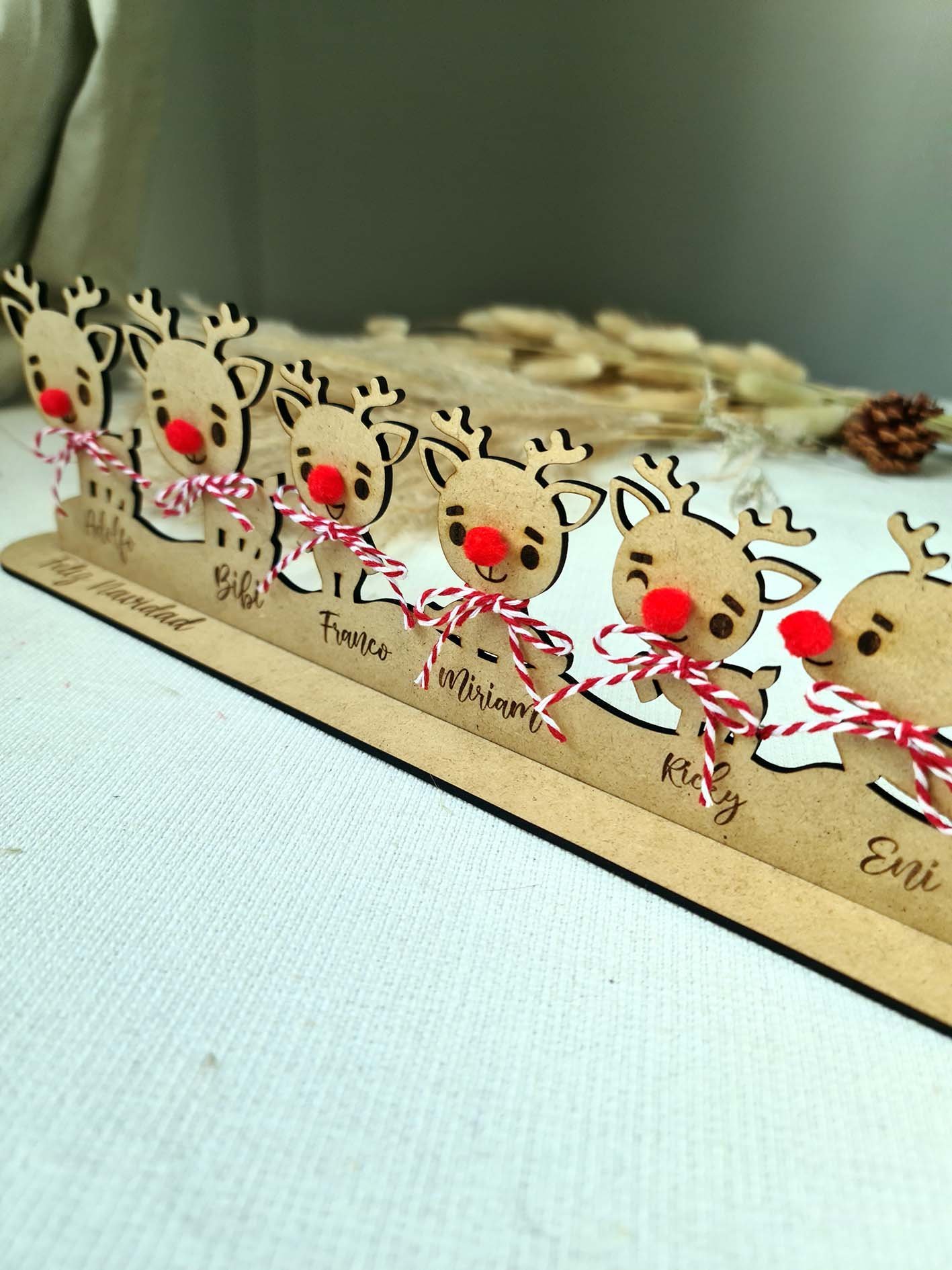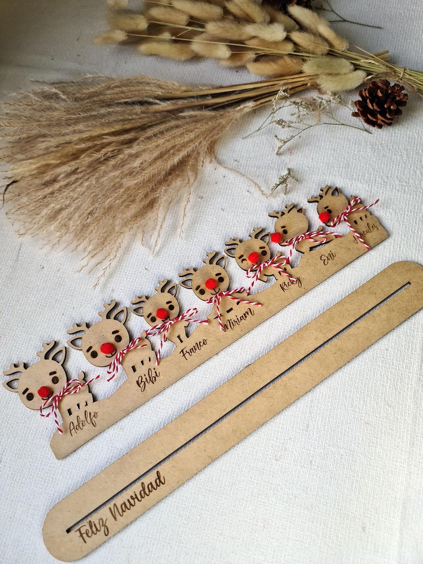 Son unos adornos preciosos que llenan cualquier rincón de espíritu navideño y harán que tu decoración sea única y especial.Cada reno está hecho con mimo y mucho detalle, y puedes personalizarlos con los nombres de tu familia, una fecha o lo que tú quieras. Así tendrás un adorno totalmente tuyo, lleno de significado.