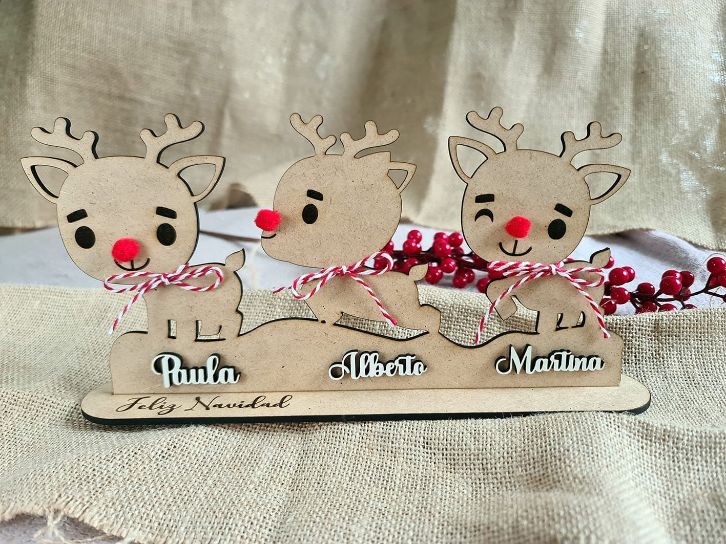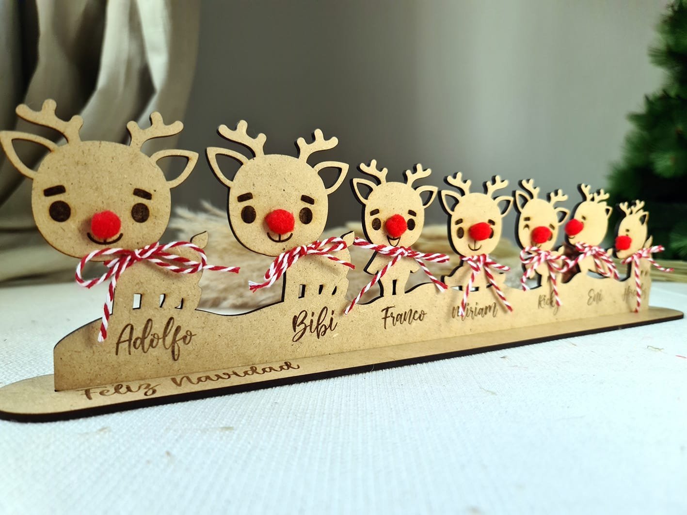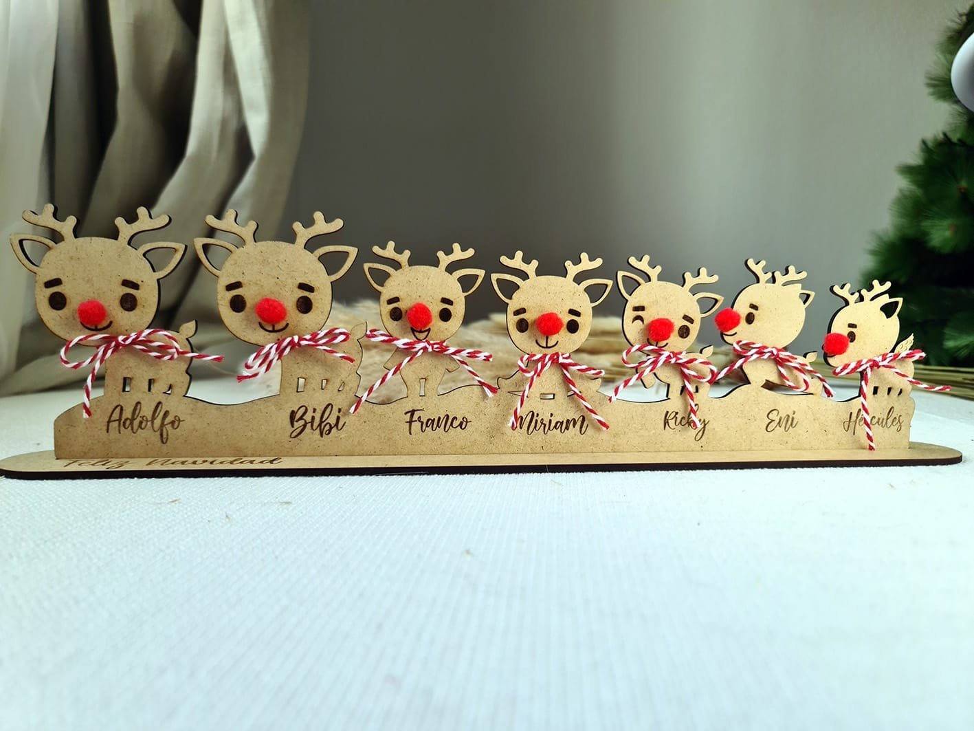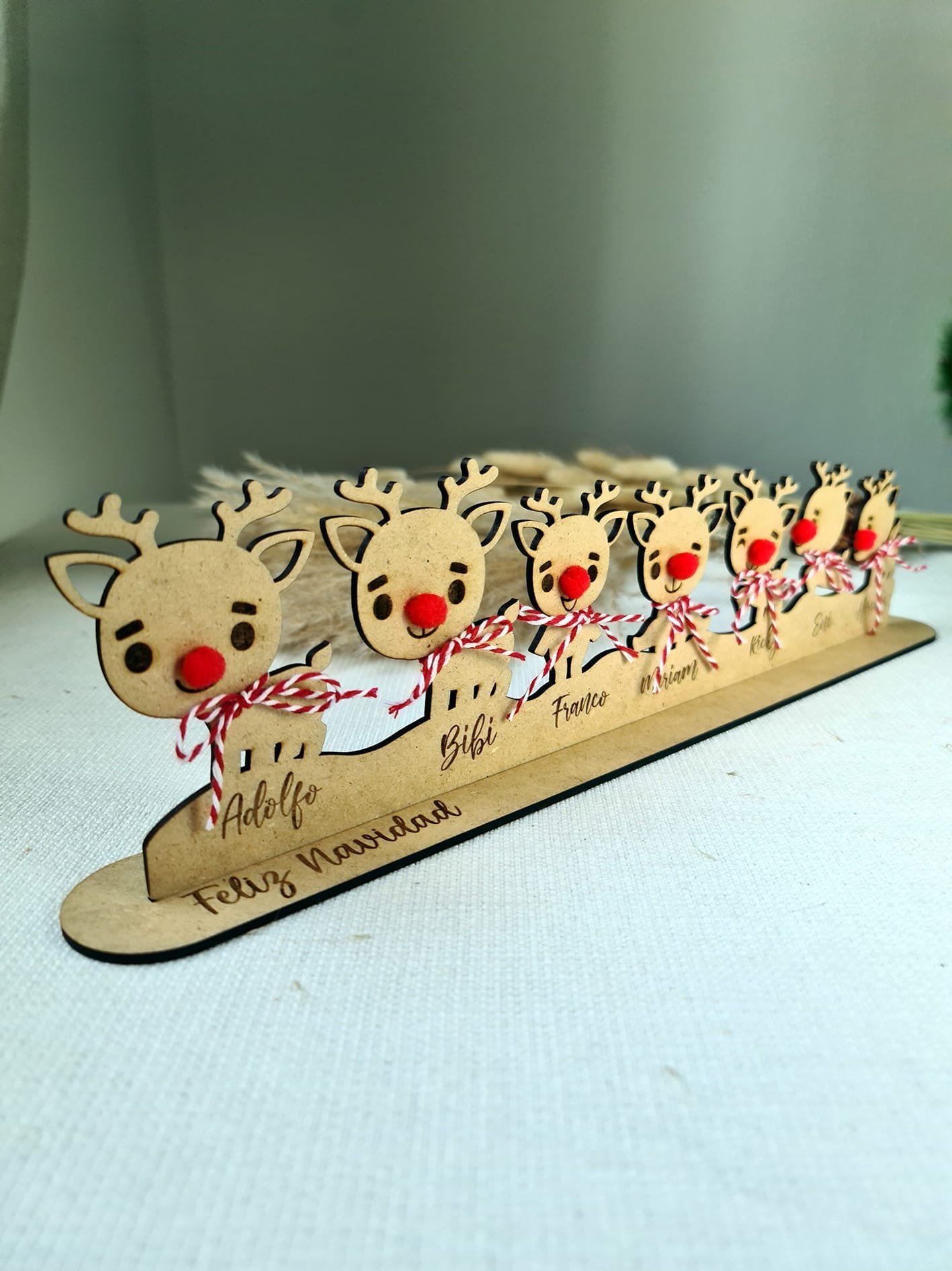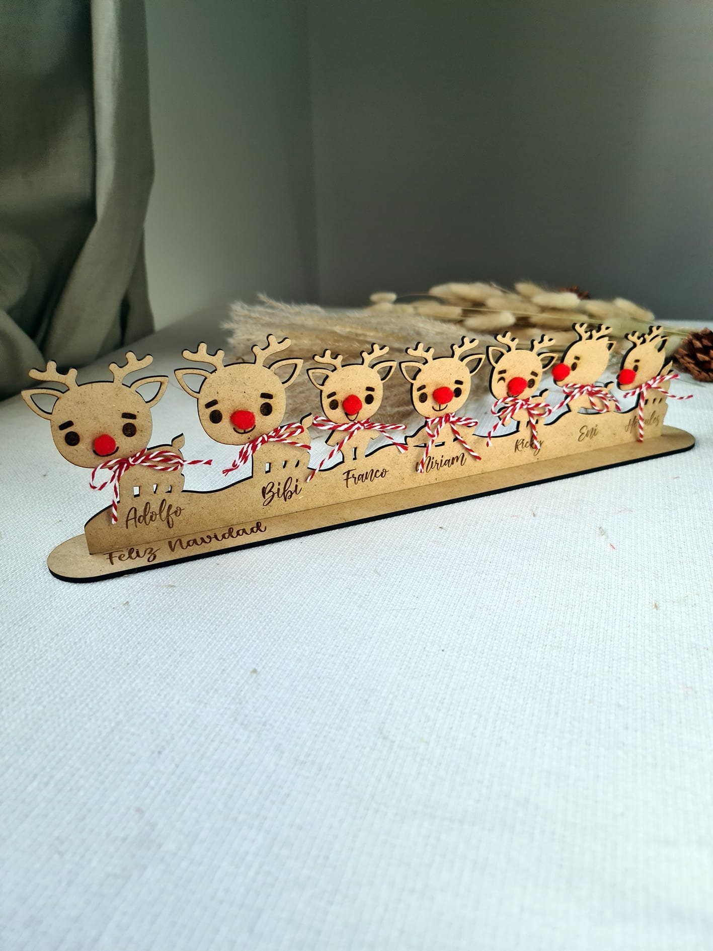 Son unos adornos preciosos que llenan cualquier rincón de espíritu navideño y harán que tu decoración sea única y especial.Cada reno está hecho con mimo y mucho detalle, y puedes personalizarlos con los nombres de tu familia, una fecha o lo que tú quieras. Así tendrás un adorno totalmente tuyo, lleno de significado.