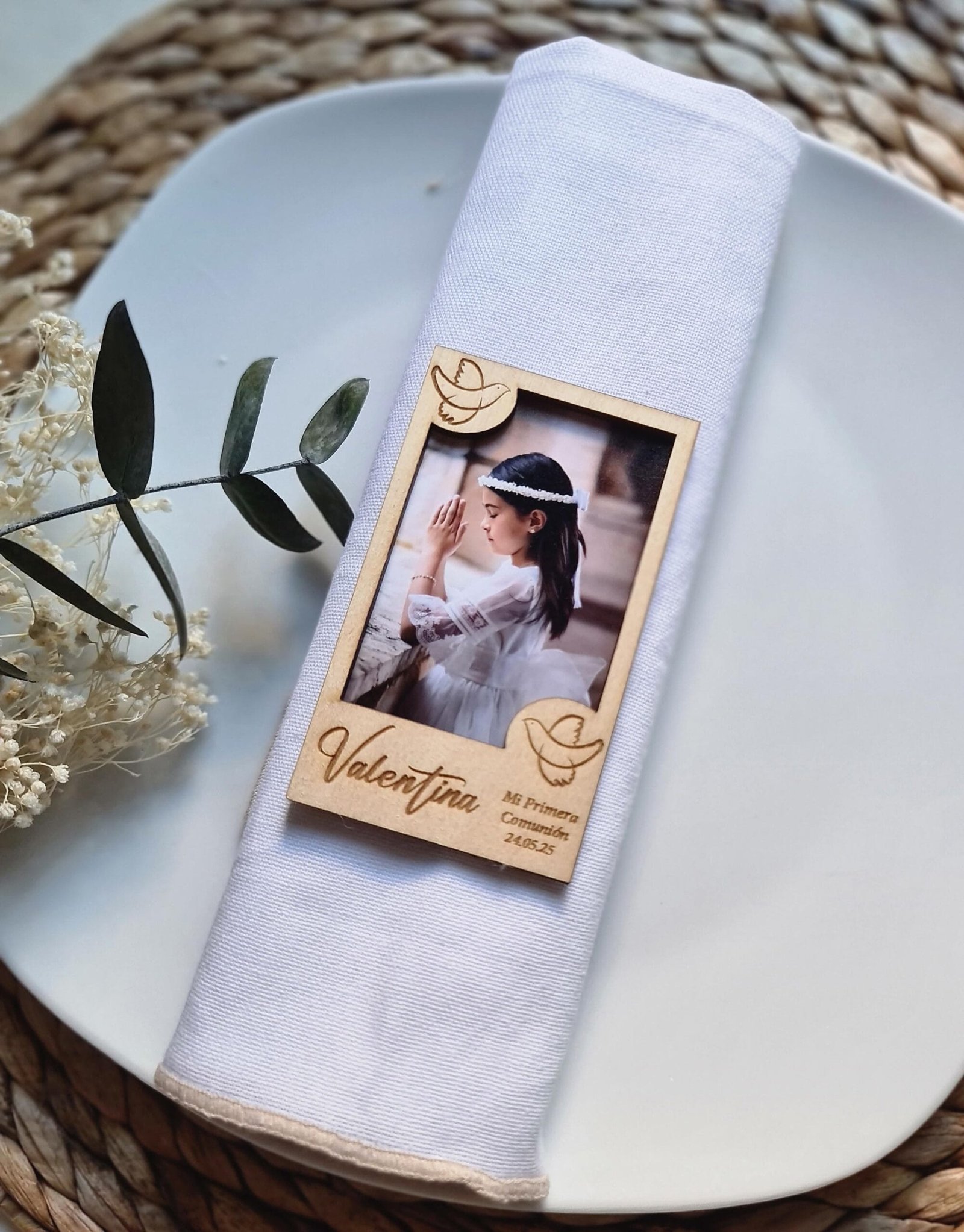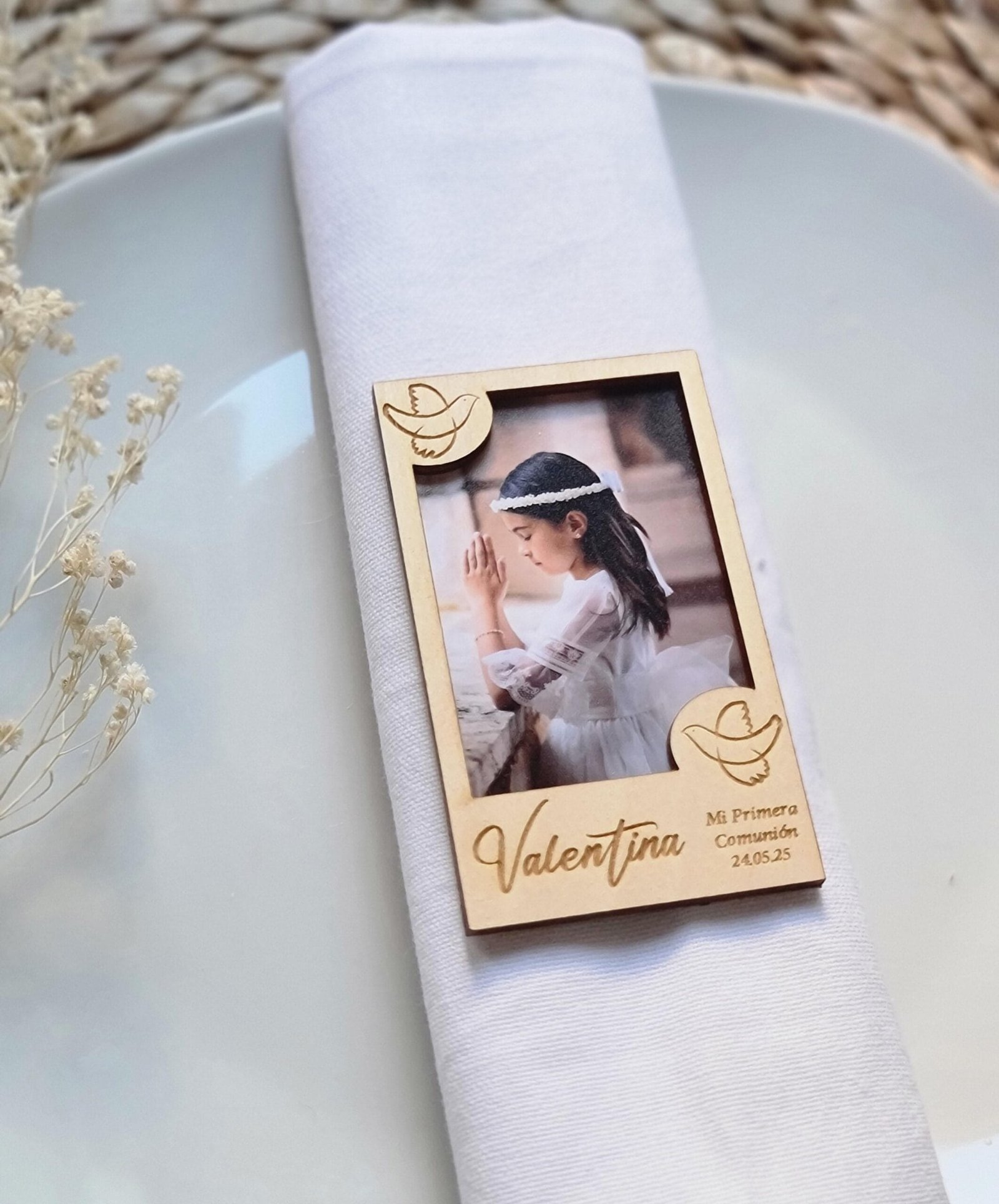 • Personalización: Grabado láser con el nombre y la fecha de la Comunión, garantizando durabilidad y detalle en cada pieza.