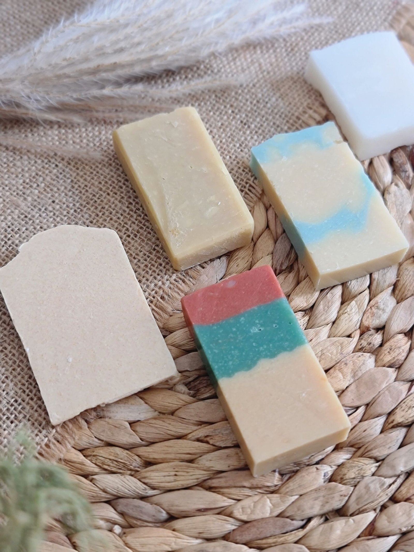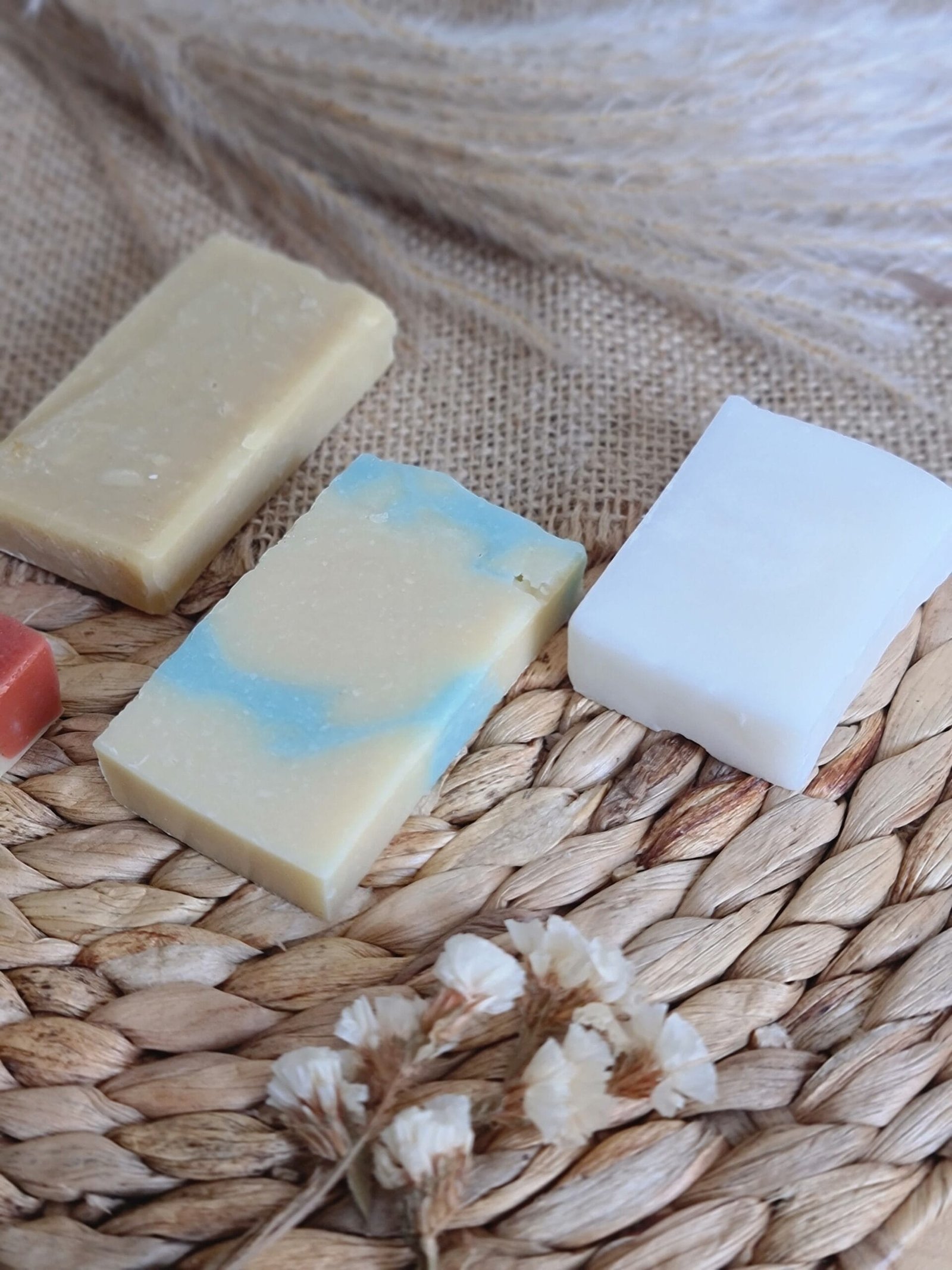 Jabón de yogur: Con aceites de oliva, coco y karité. El yogur aporta confort a la piel dañada, suaviza y nutre las pieles atópicas y con dermatitis. Lleva aroma de jazmín, naranja y canela. Jabón de aguacate y agua del mar: Con aceites de oliva, coco, karité, cacao y ricino. A parte como sobre engrasado, lleva aceite de aguacate batido con la pulpa de aguacate. Para pieles secas y deshidratadas. Aroma de aceites esenciales de bergamota, cedro y lavanda. Jabón mediterráneo: Con aceites de oliva, coco, karité y almendra (macerado con lavanda). Es un jabón suave y relajante con una cremosidad suave, un jabón clásico en la base y con muy buenos resultados. Aroma con aceite esencial de naranja y lavanda. Jabón de coco 100%: Equilibra el PH, suaviza la piel, pieles atópicas, antimicrobiano, ideal para pieles sensibles. Aroma de coco. Jabón de leche de cabra: Con aceites de oliva, coco, karité, manteca de mango, aceite de arroz, aceite de ricino además arcilla blanca o caolín y leche de cabra en polvo. Con aceites de romero, naranja, litsea y lavanda. Sobre todo propiedades regenerativas. es nutritivo, humectante, rejuvenecedor, previene el agrietamiento debido a las proteínas de la leche. Peso: 40gr aproximadamente Hacemos descuentos por cantidades Nota importante: Al tratarse de un producto 100% artesanal hecho a medida, requiere su tiempo de preparación. Tienes que hacer el pedido como mínimo con 1 mes de antelación