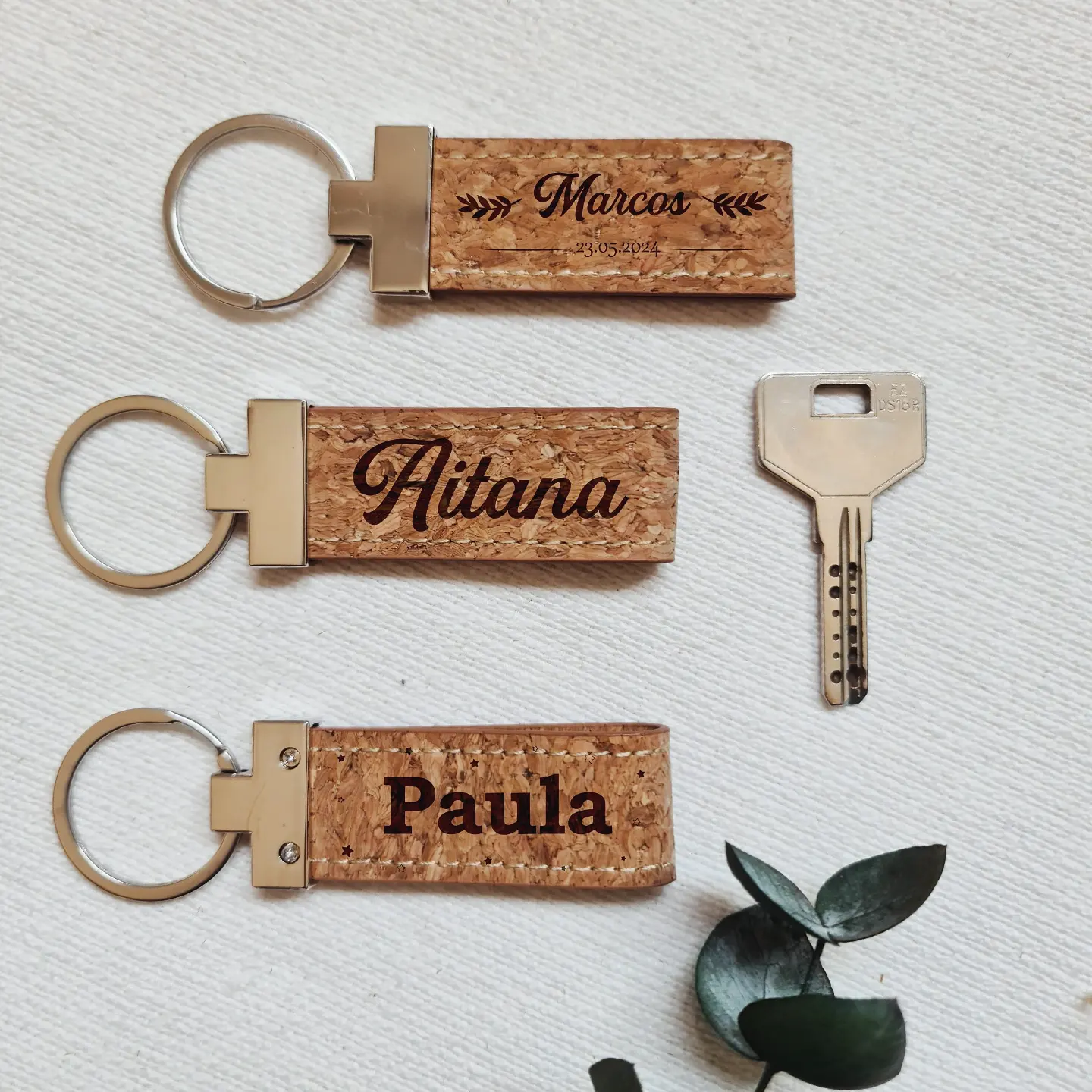 Llaveros de acero inoxidable y corcho natural son ideales para regalar a tus invitados en el día de tu boda