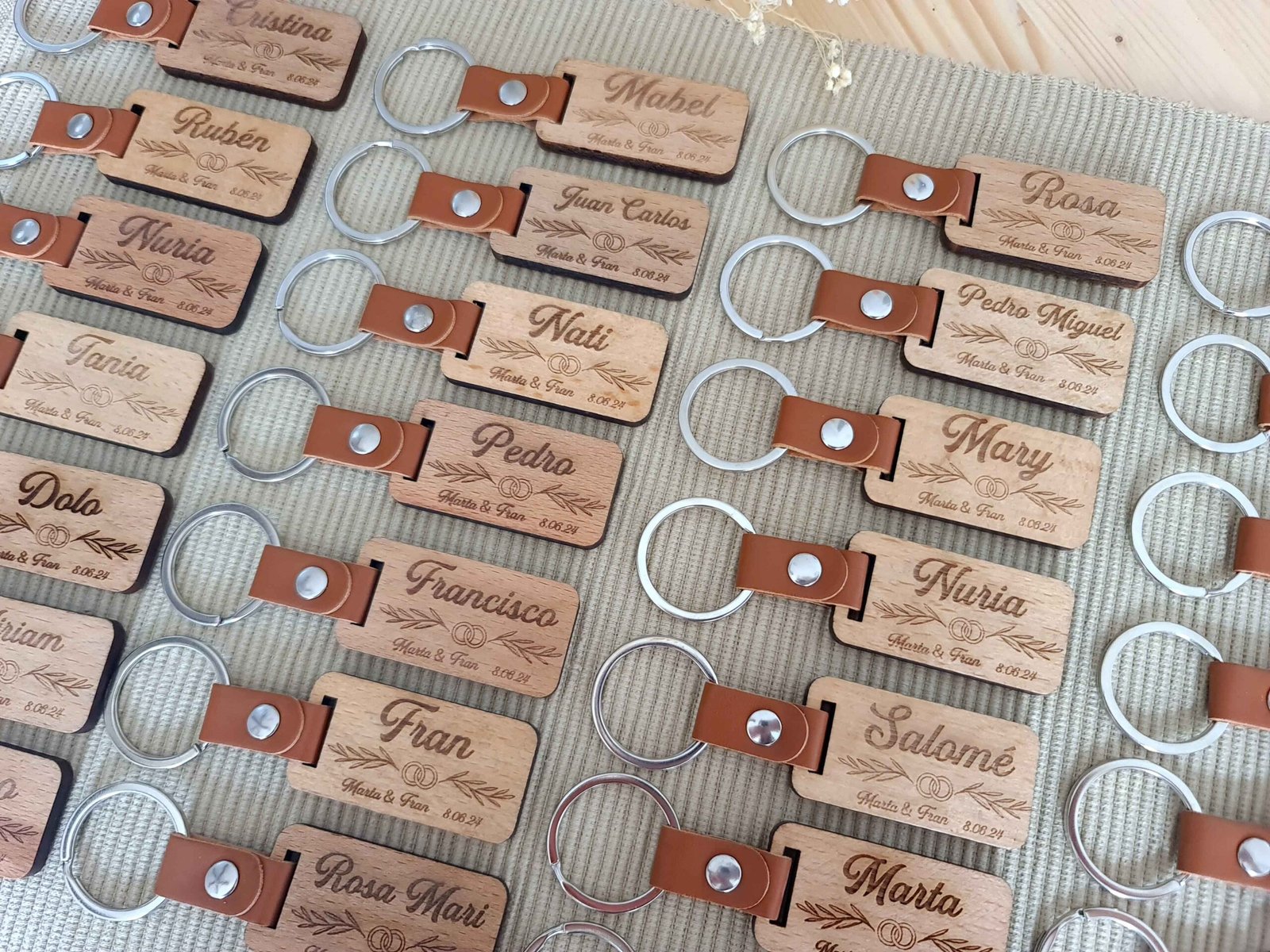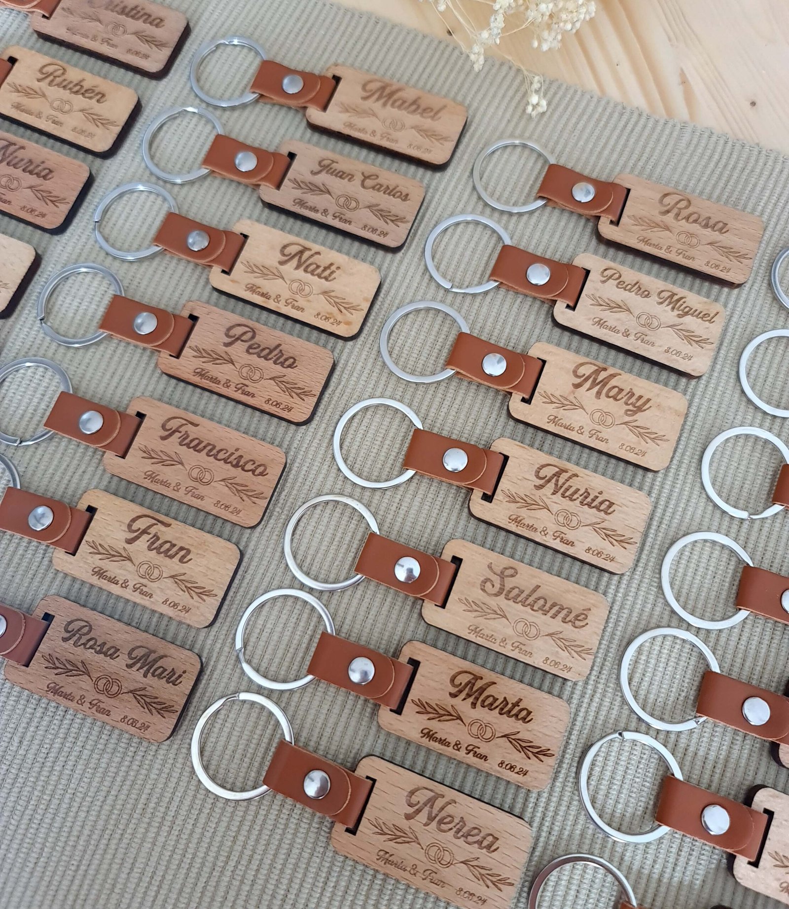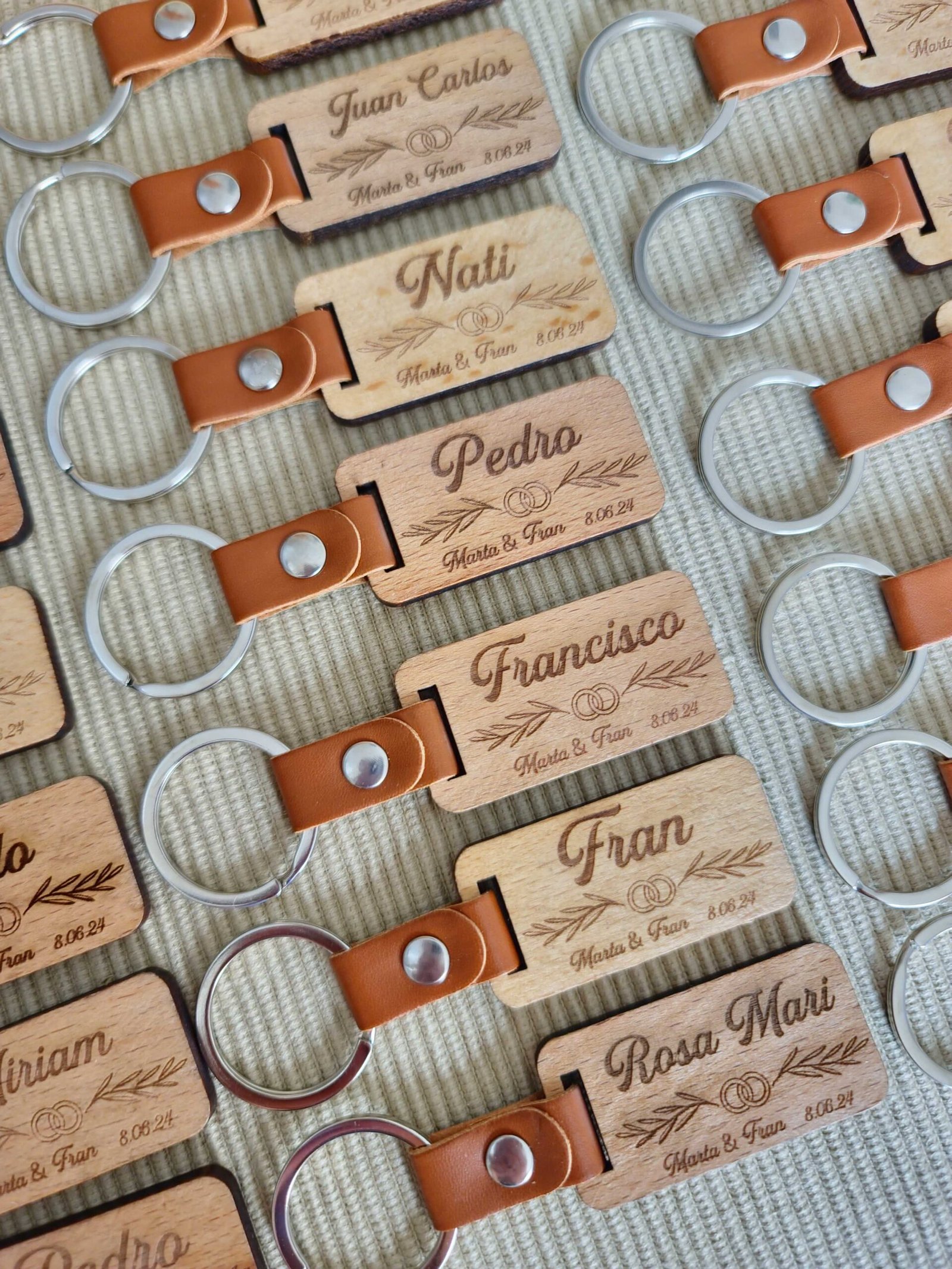 Llavero de madera y cuero personalizado para bodas – detalle original para tus invitados Si buscas un detalle de boda original, económico y útil, este llavero de madera personalizado es una opción perfecta. Un regalo práctico que tus invitados podrán usar a diario y recordar ese día especial cada vez que lo vean. Fabricado en madera natural y grabado con láser de alta precisión, permite personalizar nombres, fecha de la boda o incluso un pequeño diseño. Su acabado limpio y su estilo sencillo hacen que encaje en cualquier tipo de boda: rústica, elegante o moderna. Es una alternativa ideal a los típicos recuerdos que acaban guardados, ya que este llavero combina diseño y funcionalidad. Además, su tamaño compacto y resistencia lo hacen perfecto para el uso diario. Características del llavero personalizado: