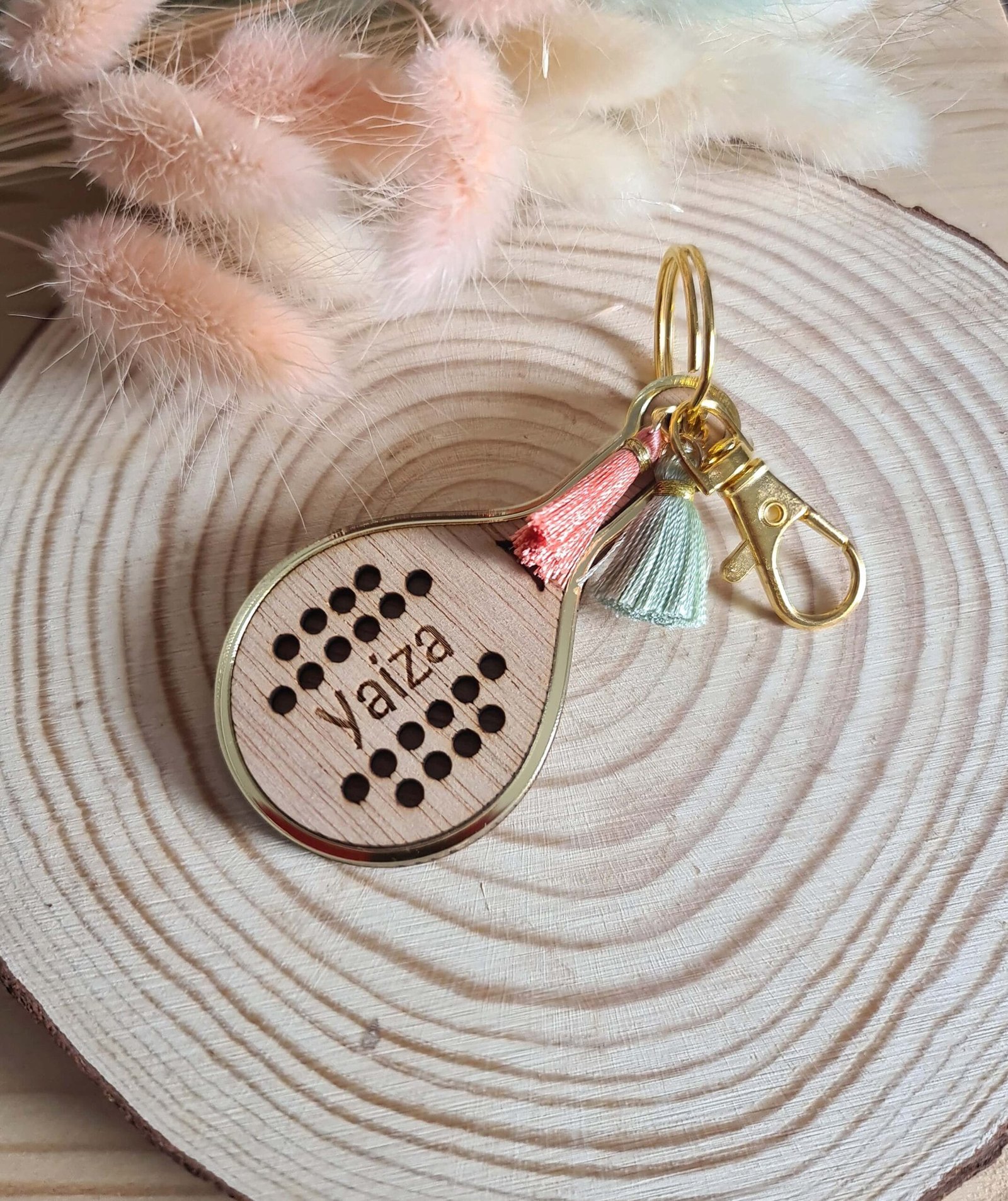 Llavero de pala de pádel personalizado, fabricado en madera de alta calidad. Este accesorio es ideal para los amantes del pádel que quieren llevar siempre consigo un detalle único y especial. Personalízalo con tu nombre o el de esa persona especial para crear un regalo original y significativo.