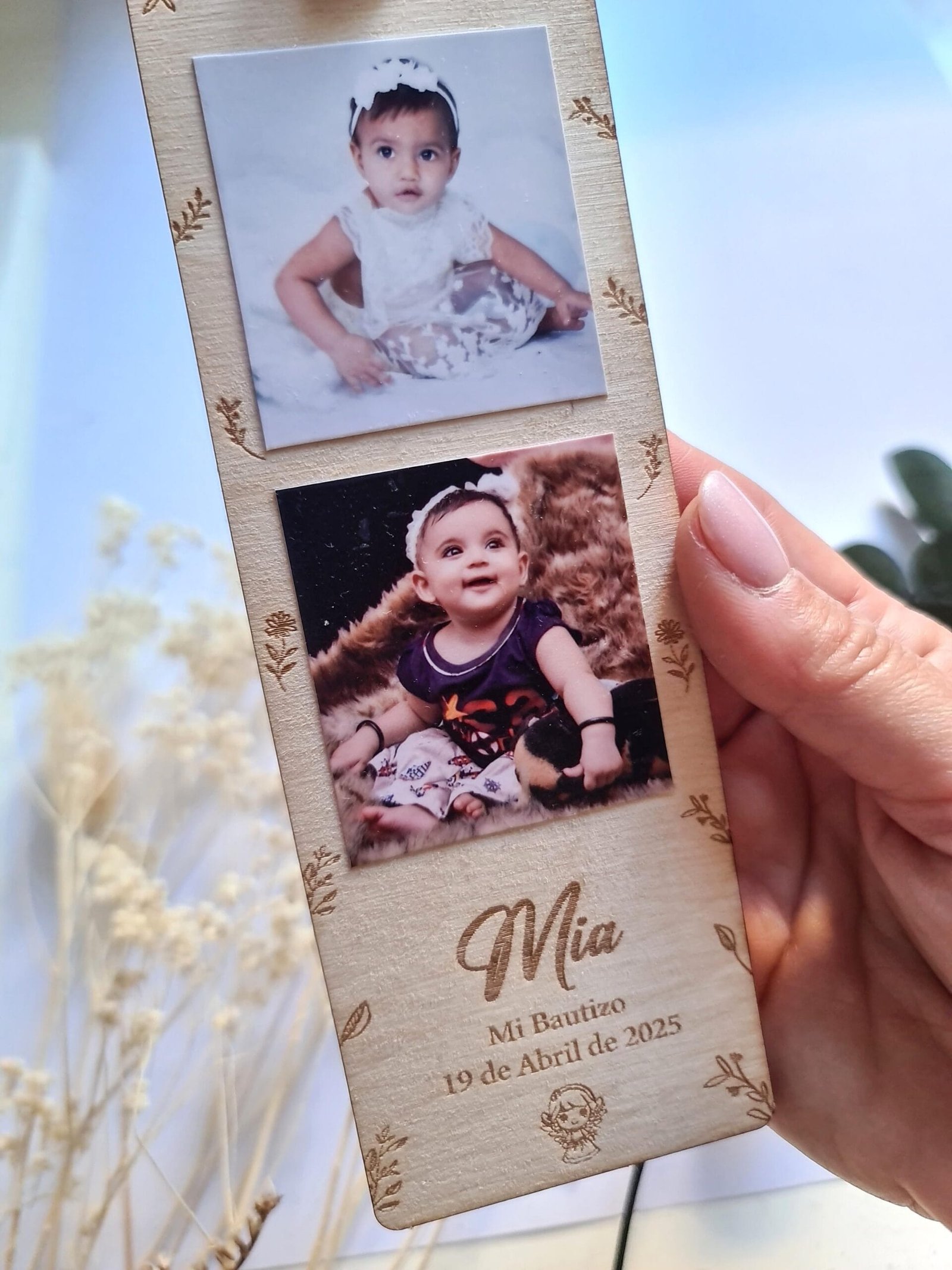 Este marcapáginas de madera personalizado es el detalle ideal para obsequiar a los invitados de tu Bautizo, convirtiéndose en un recuerdo único y lleno de significado. Fabricado en madera de alta calidad, su diseño elegante y natural refleja la esencia del día tan especial, y la posibilidad de personalizarlo con el nombre del bebé y la fecha del evento lo convierte en un regalo exclusivo y memorable.