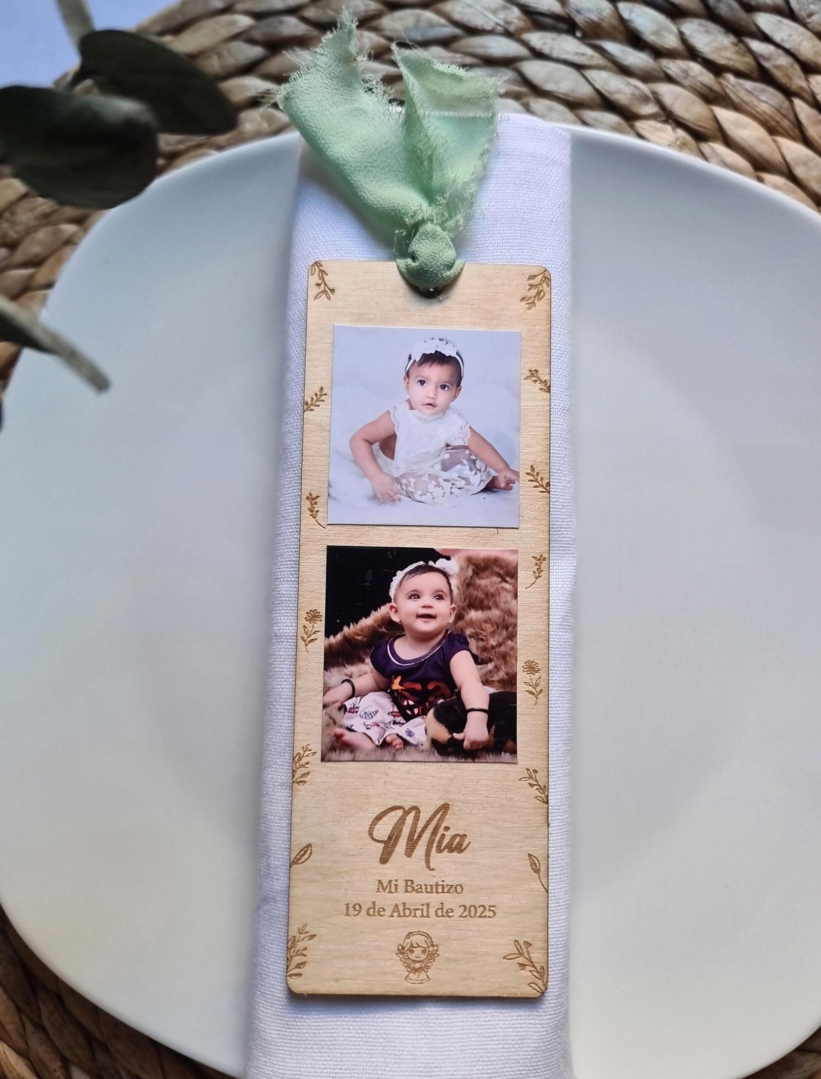 El marcapáginas de madera para Bautizo personalizado es el detalle perfecto para agradecer a tus invitados en el día tan especial del Bautizo de vuestro bebé. Con una elegante y delicada temática, cada marcapáginas puede ser grabado con el nombre del bebé y la fecha del Bautizo, creando un recuerdo único y significativo que acompañará a tus seres queridos por mucho tiempo.