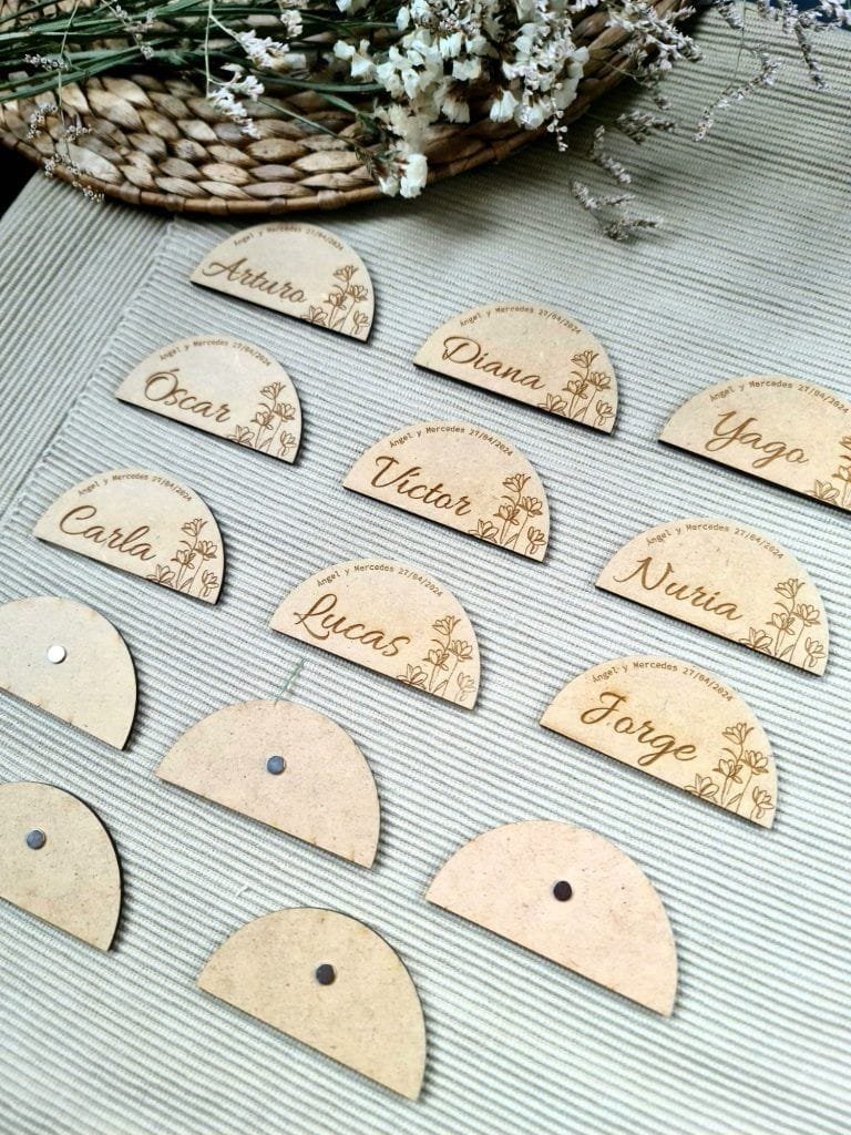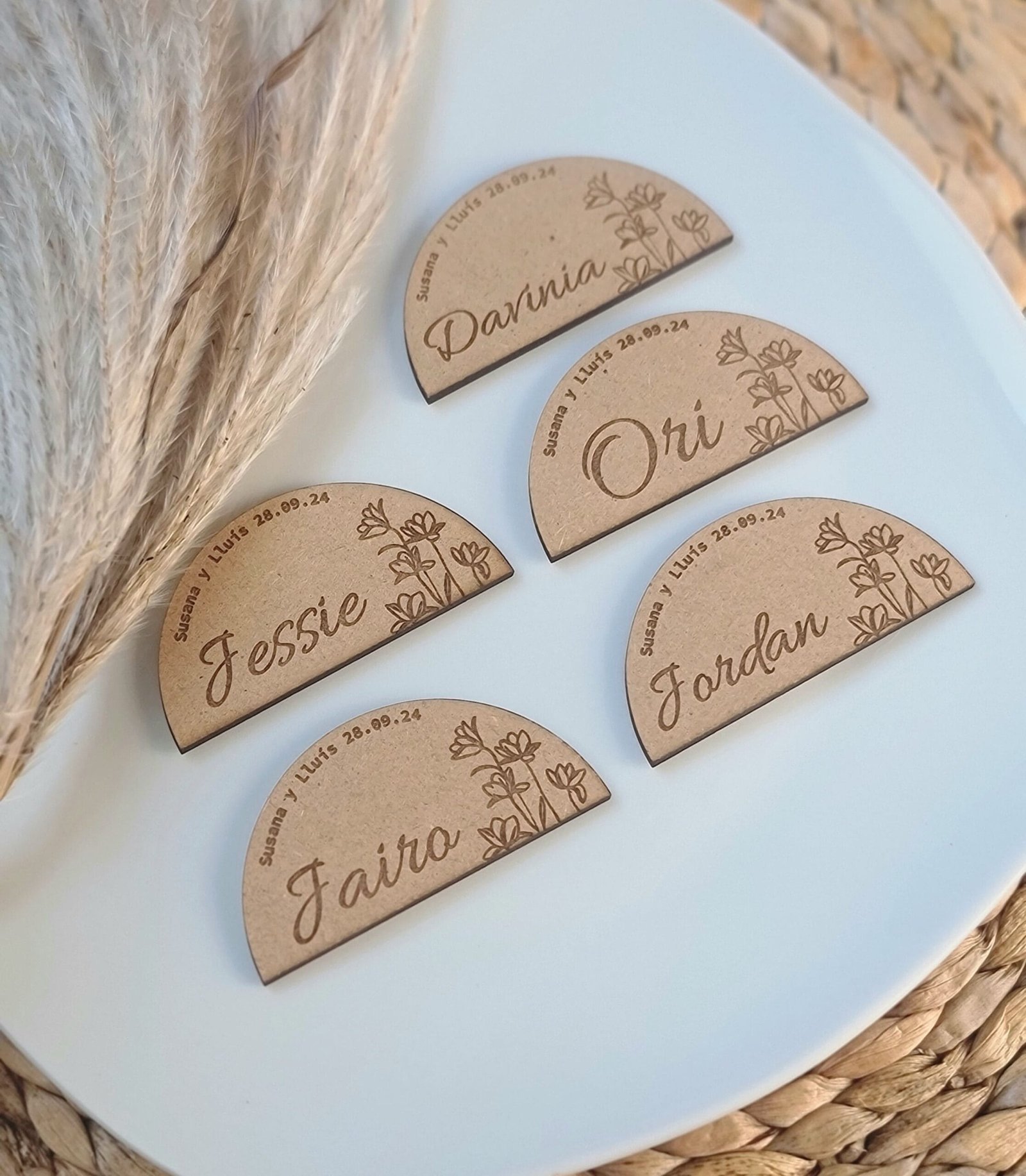 Marcasitios de madera estilo abanico son ideales para decorar los platos de tus invitados. Perfecta opción para cualquier evento o celebración, bodas, bautizos, comuniones, cumpleaños, comidas y cenas de empresa etc. Hacemos descuentos por cantidades. Compra minima: 9 uds. Medidas: 3-4cm de altura y 7-10cm de largo (depende del nombre) Materiales: Madera MDF de 3 mm de grosor, un material bonito y duradero que añade un toque rústico a la decoración de los platos de tus invitados. Diseñado y fabricado con mucho mimo por nosotros en nuestro taller en Alicante, España. Envíos a toda Europa. Consulta el precio de tu envío en el carrito de compra. Tras finalizar la compra de tus marcasitios envíanos la lista con los nombres de tus invitados a nuestro email info@tachancreaciones.com indicando en número del pedido. Plazos de entrega: Entre 1 semana si es un pedido de menos de 100 unidades a 3 semanas si es más de 100 uds. ¿Haz tu pedido con antelación! Pero si te ha pillado el toro y necesitas tu pedido con urgencia, contáctanos y vemos que podemos hacer ;) Pregúntanos por Whatsapp 604 96 12 96 el tiempo de entrega exacto de tu pedido.