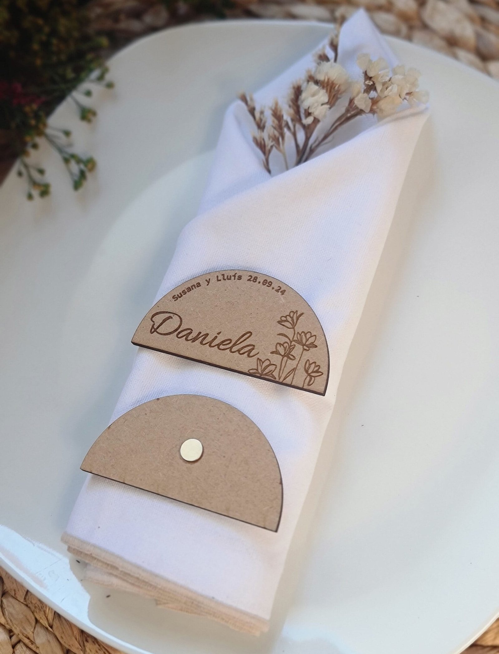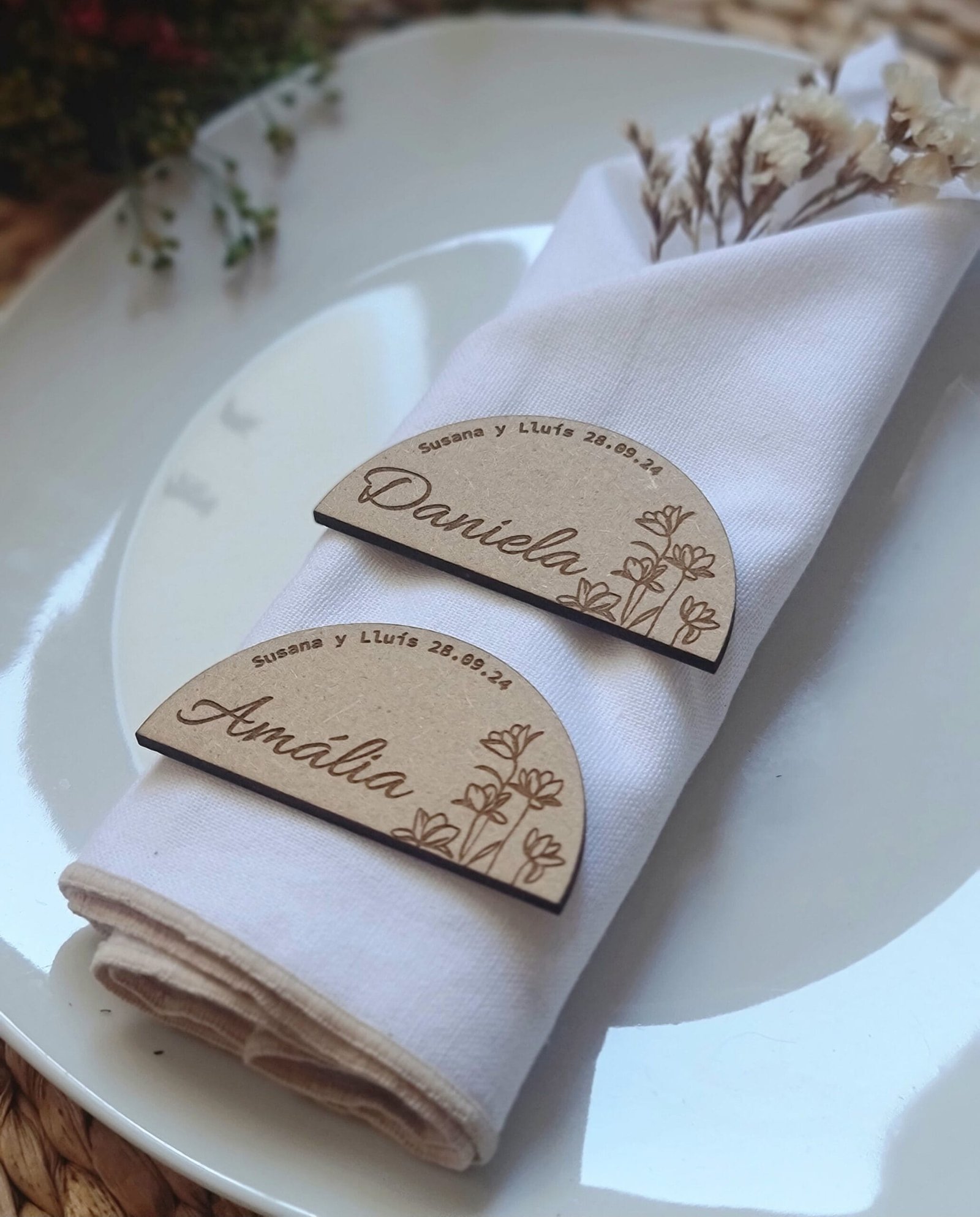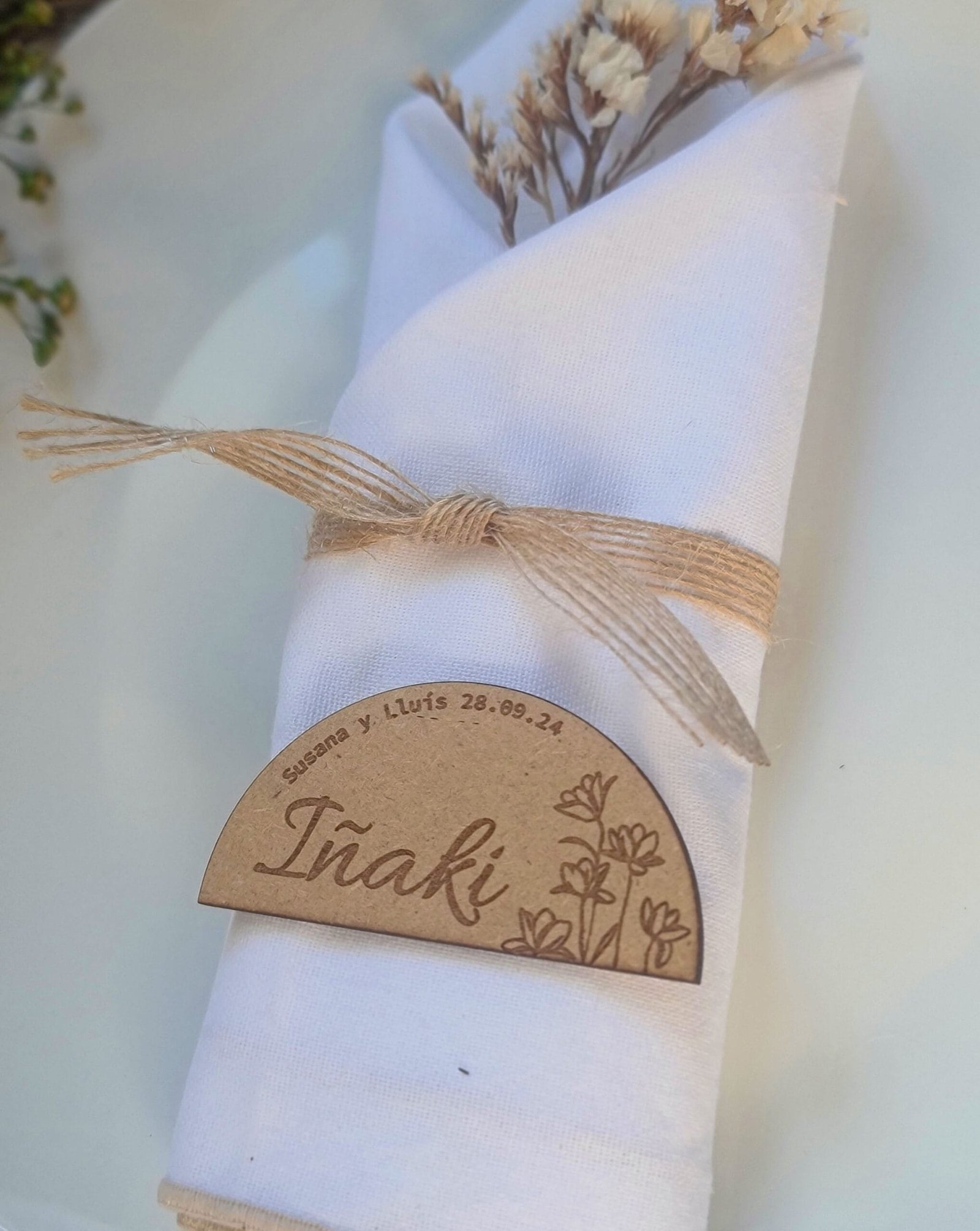 La personalización de los marcasitios garantiza que cada pieza sea única, reflejando el estilo y la esencia de la pareja. Ideal para añadir un detalle rústico y personalizado a tu celebración.