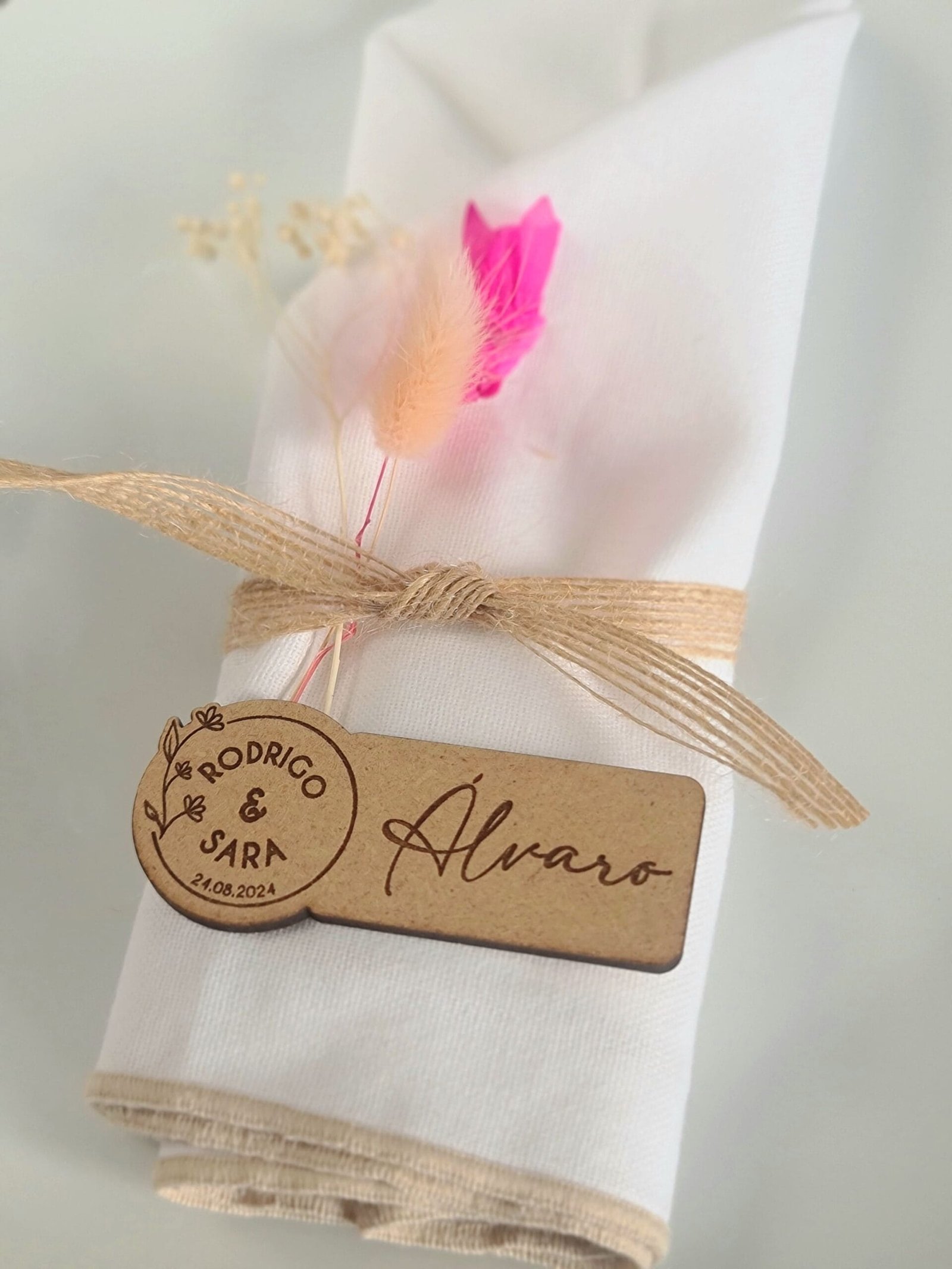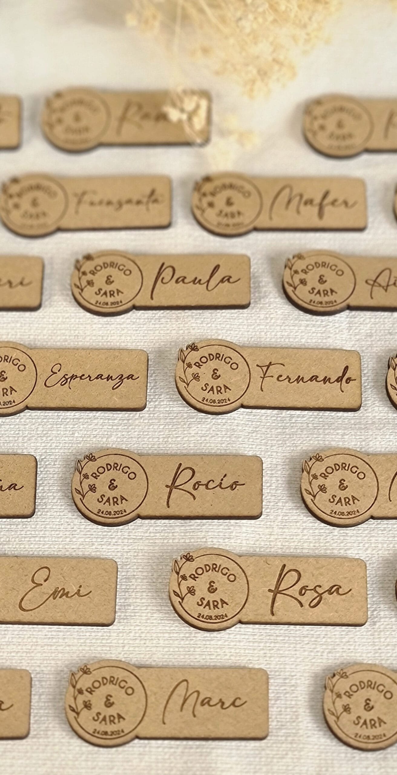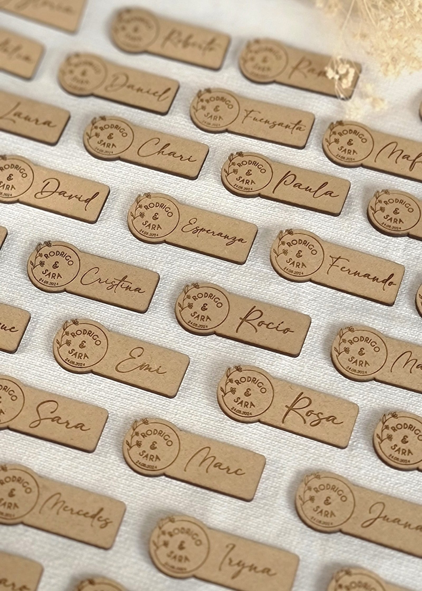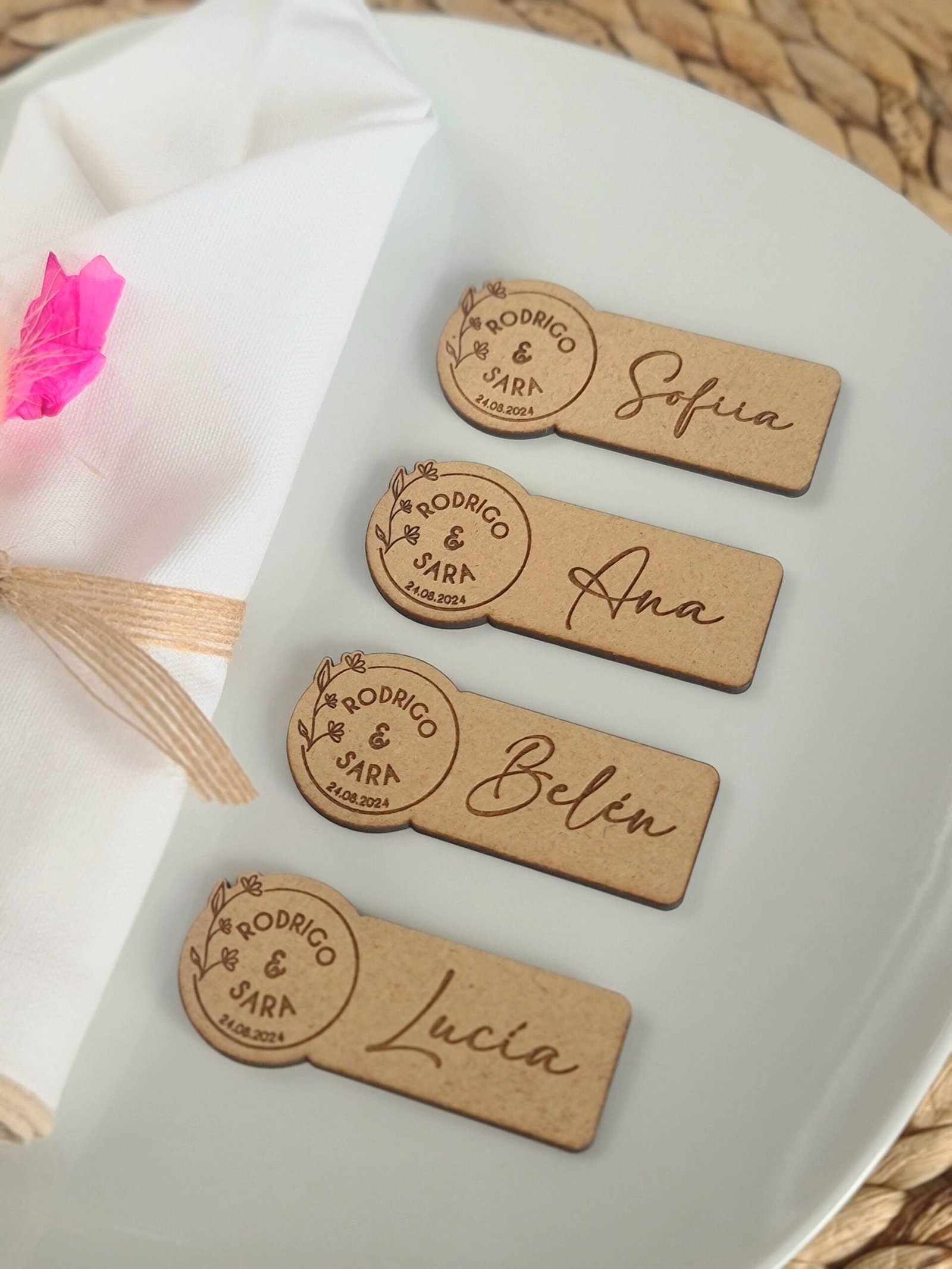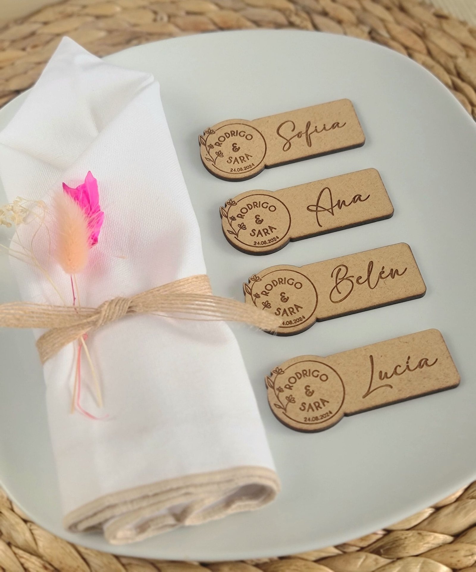 Madera MDF de 3 mm de grosor, un material bonito y duradero que añade un toque rústico a la decoración de los platos de tus invitados. Diseñado y fabricado con mucho mimo por nosotros en nuestro taller en Alicante, España. Envíos a toda Europa. Consulta el precio de tu envío en el carrito de compra.Plazos de entrega: