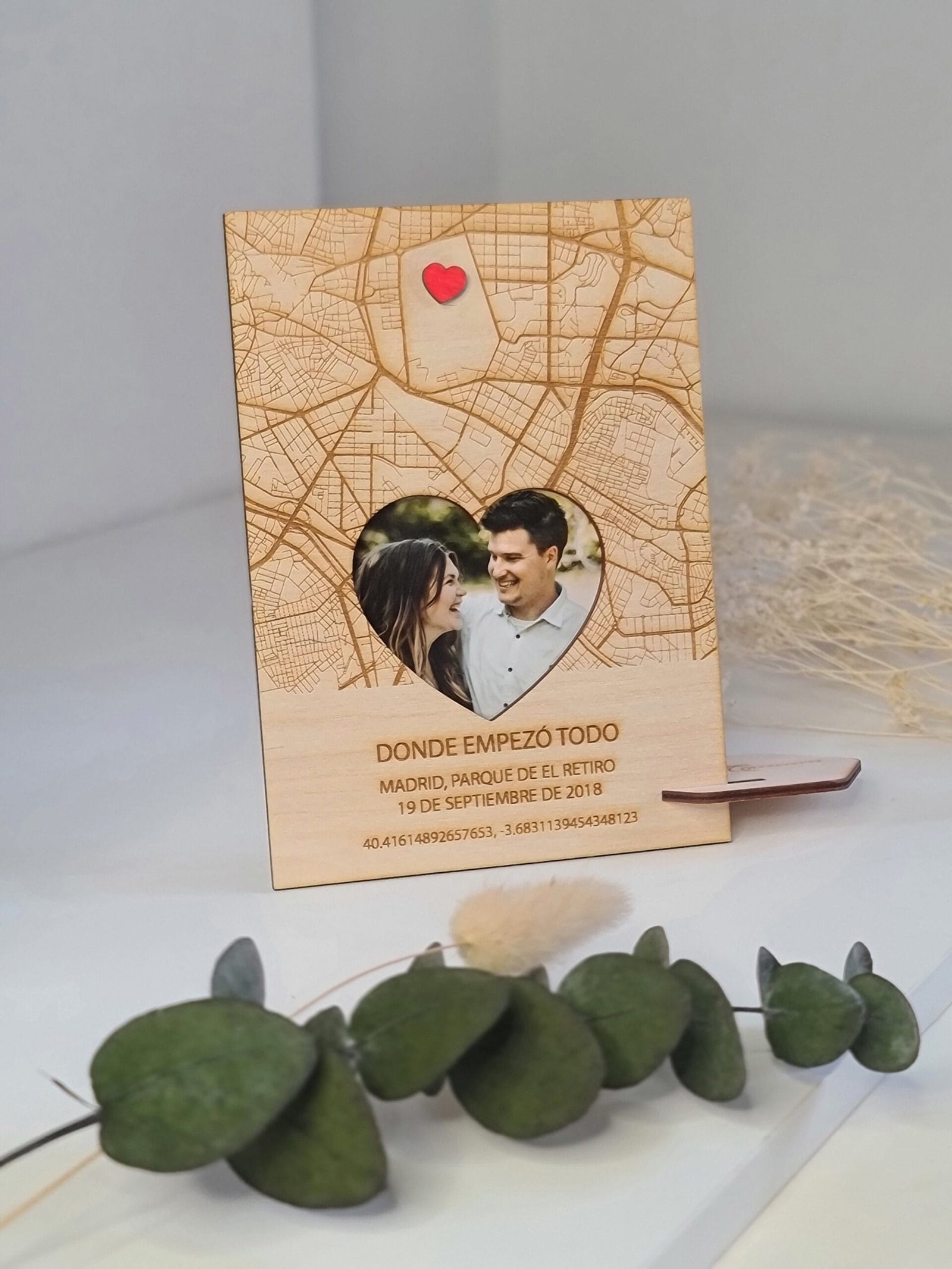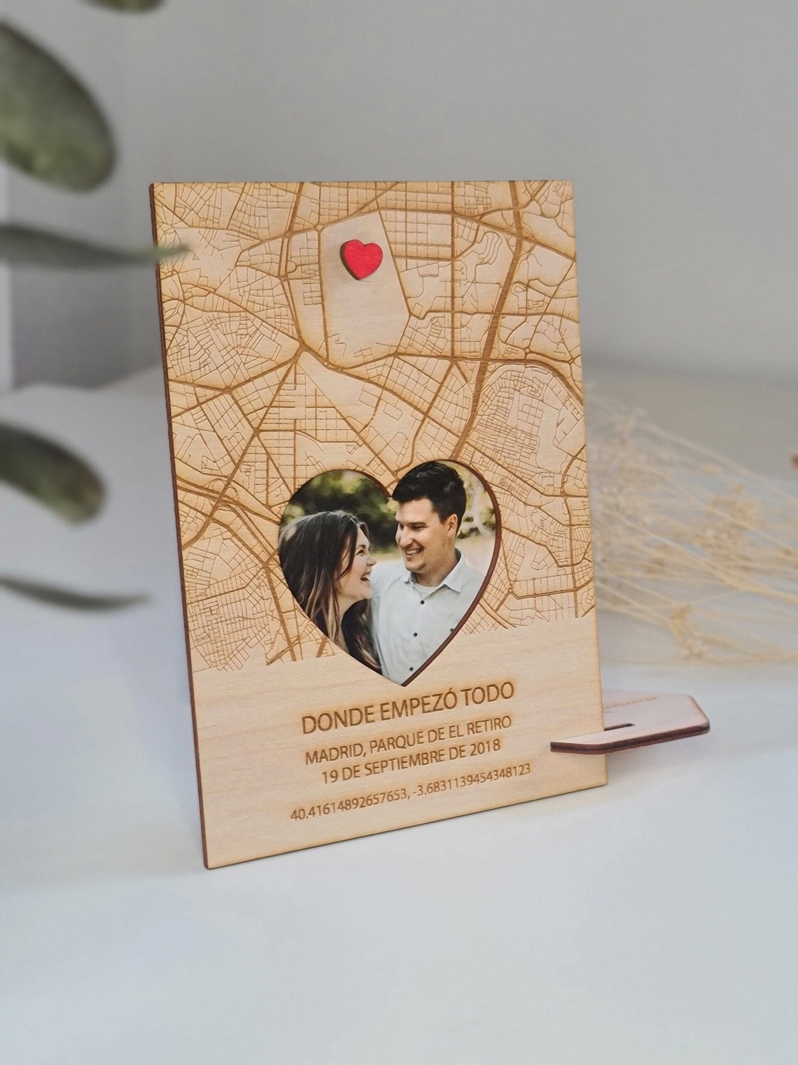Un regalo único que incluye un mapa grabado en madera y una foto en forma de corazón. Perfecto para aniversarios, San Valentín y cumpleaños, ideal para capturar y recordar momentos especiales en un solo detalle emotivo y elegante.