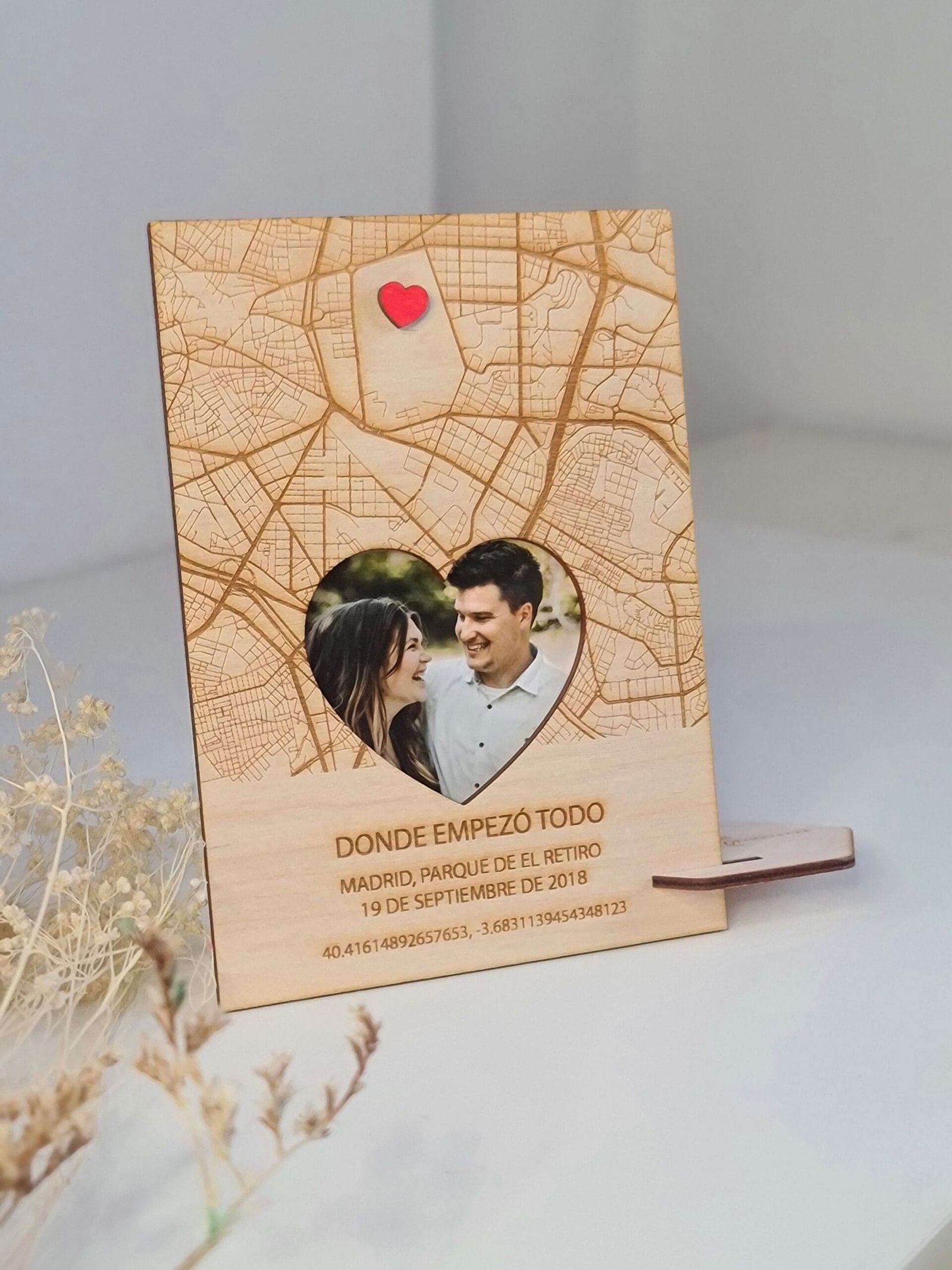 Un regalo único que incluye un mapa grabado en madera y una foto en forma de corazón. Perfecto para aniversarios, San Valentín y cumpleaños, ideal para capturar y recordar momentos especiales en un solo detalle emotivo y elegante.