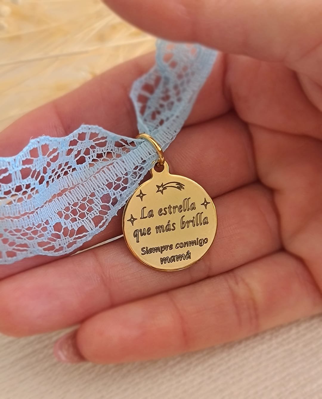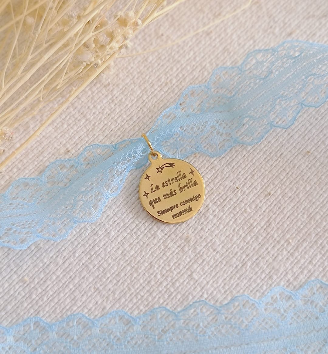 Complementa tu ramo de novia con esta elegante medalla de acero inoxidable en color oro, un detalle único y lleno de significado. Disponible en varios tamaños, puedes personalizarla para que se adapte perfectamente a tu estilo.