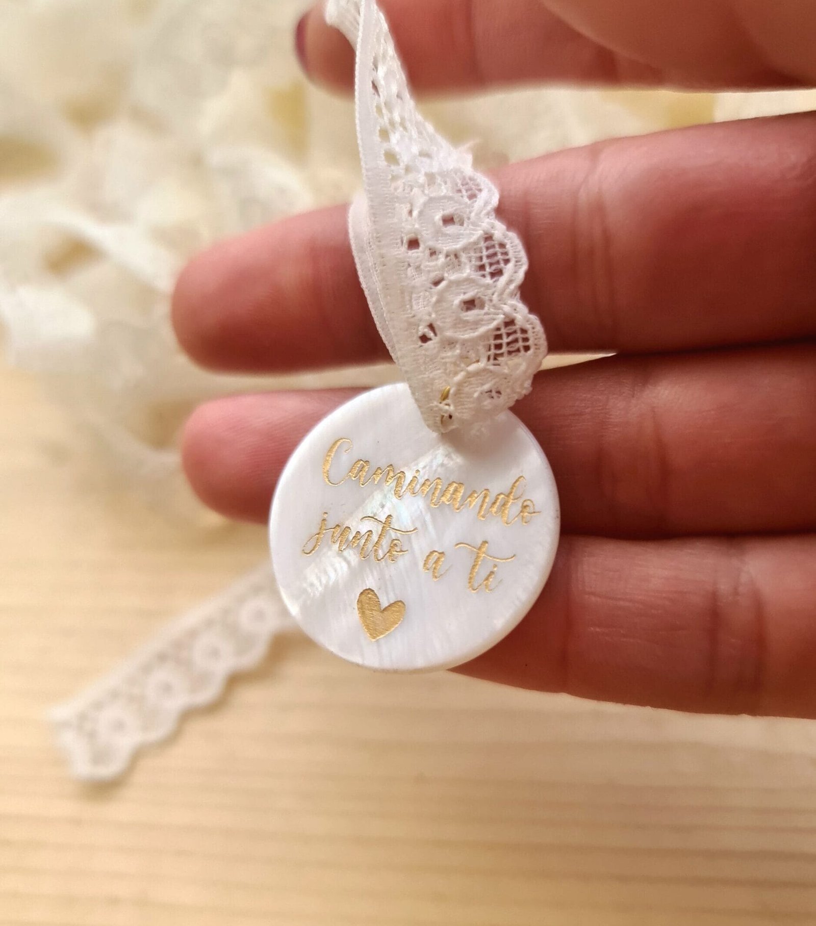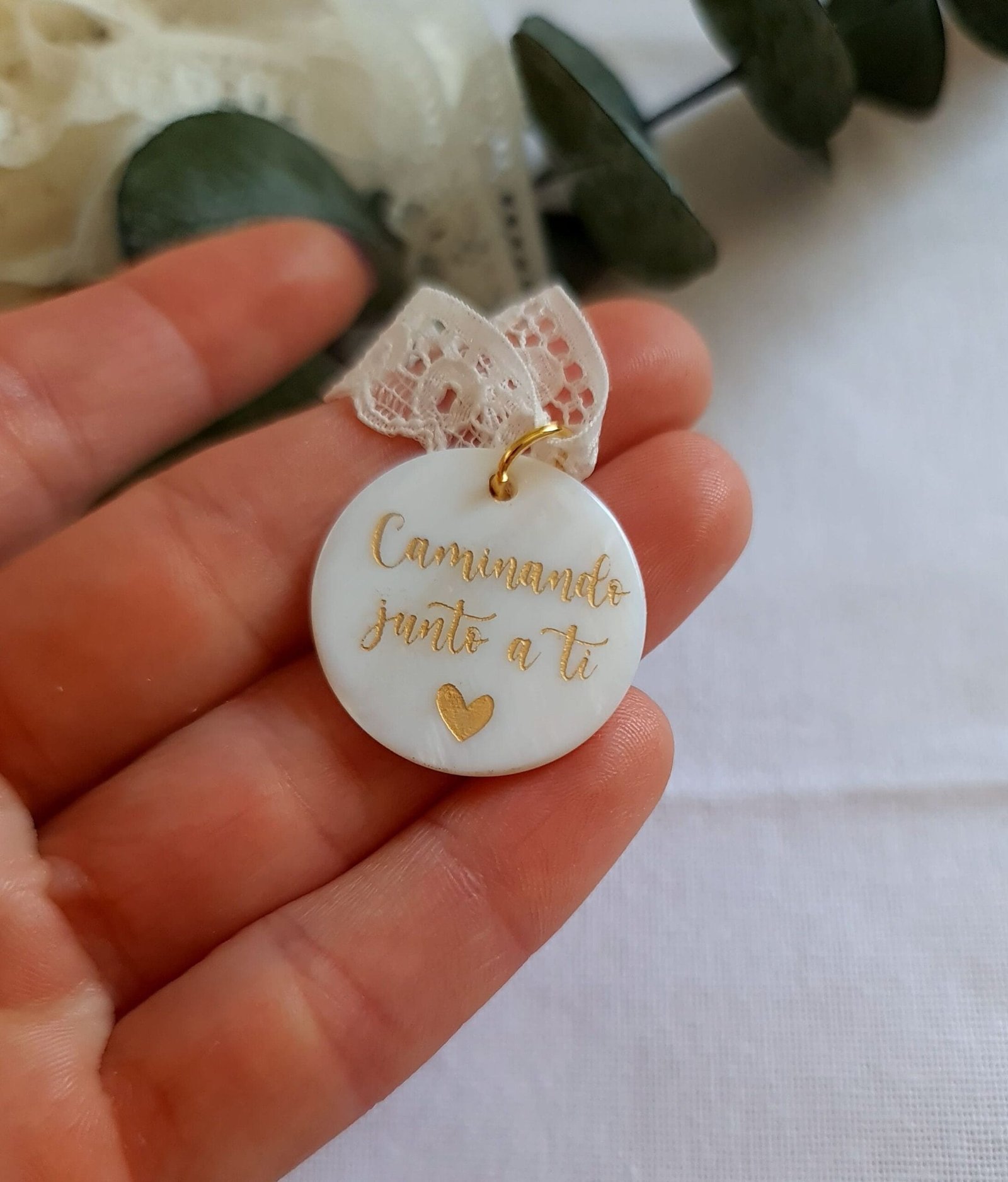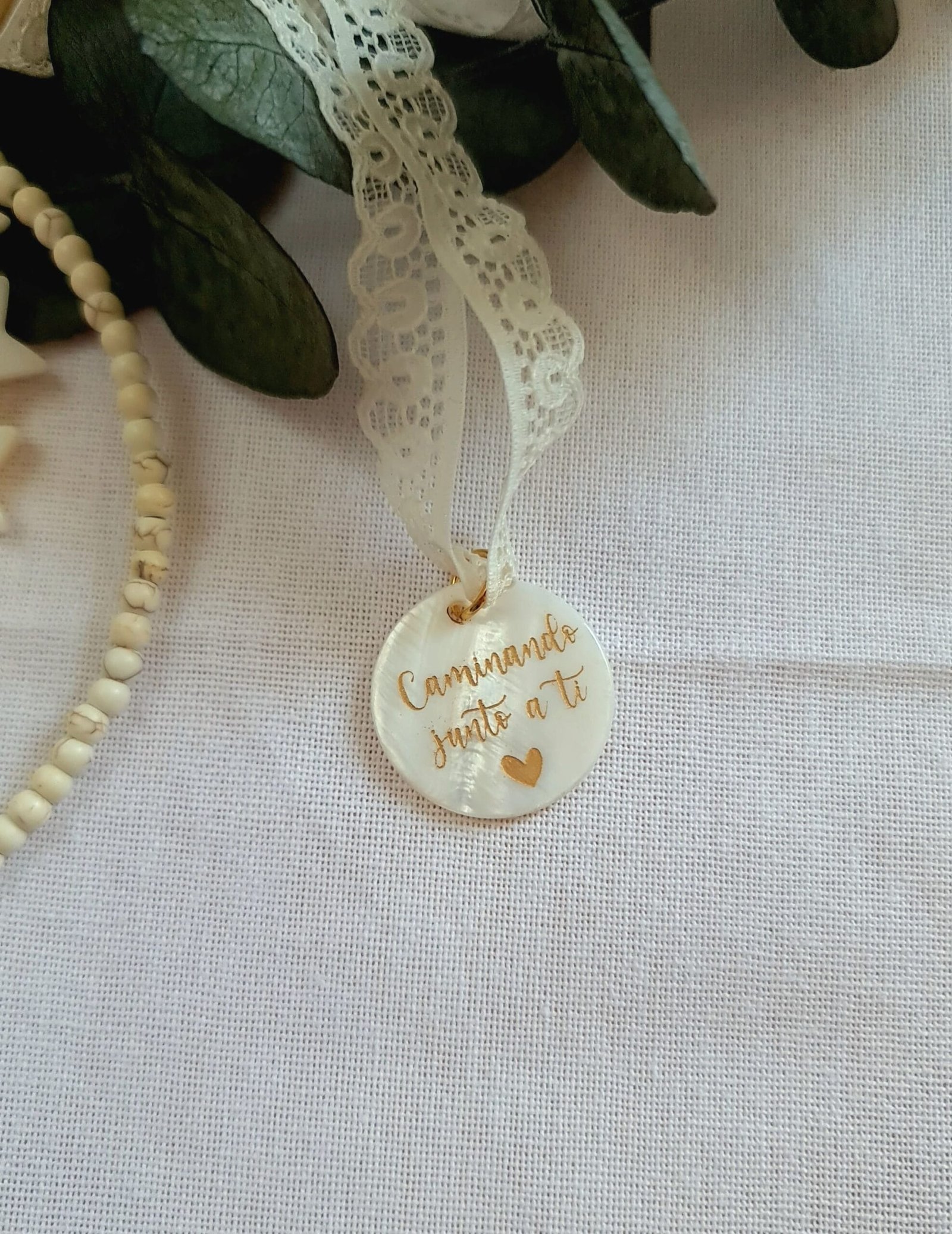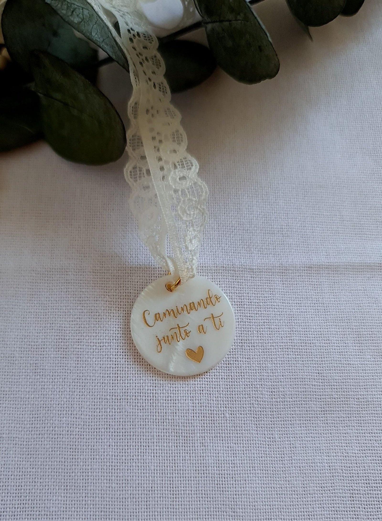 Complementa tu ramo de novia con esta elegante medalla de nacar y una frase personalizada en color oro, un detalle único y lleno de significado. Puedes personalizarla para que se adapte perfectamente a tu estilo.