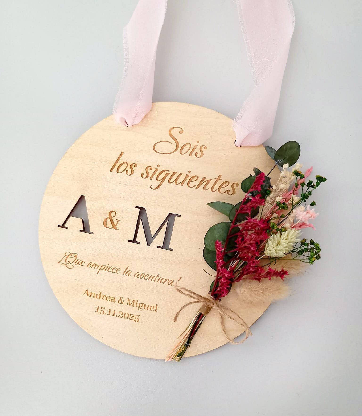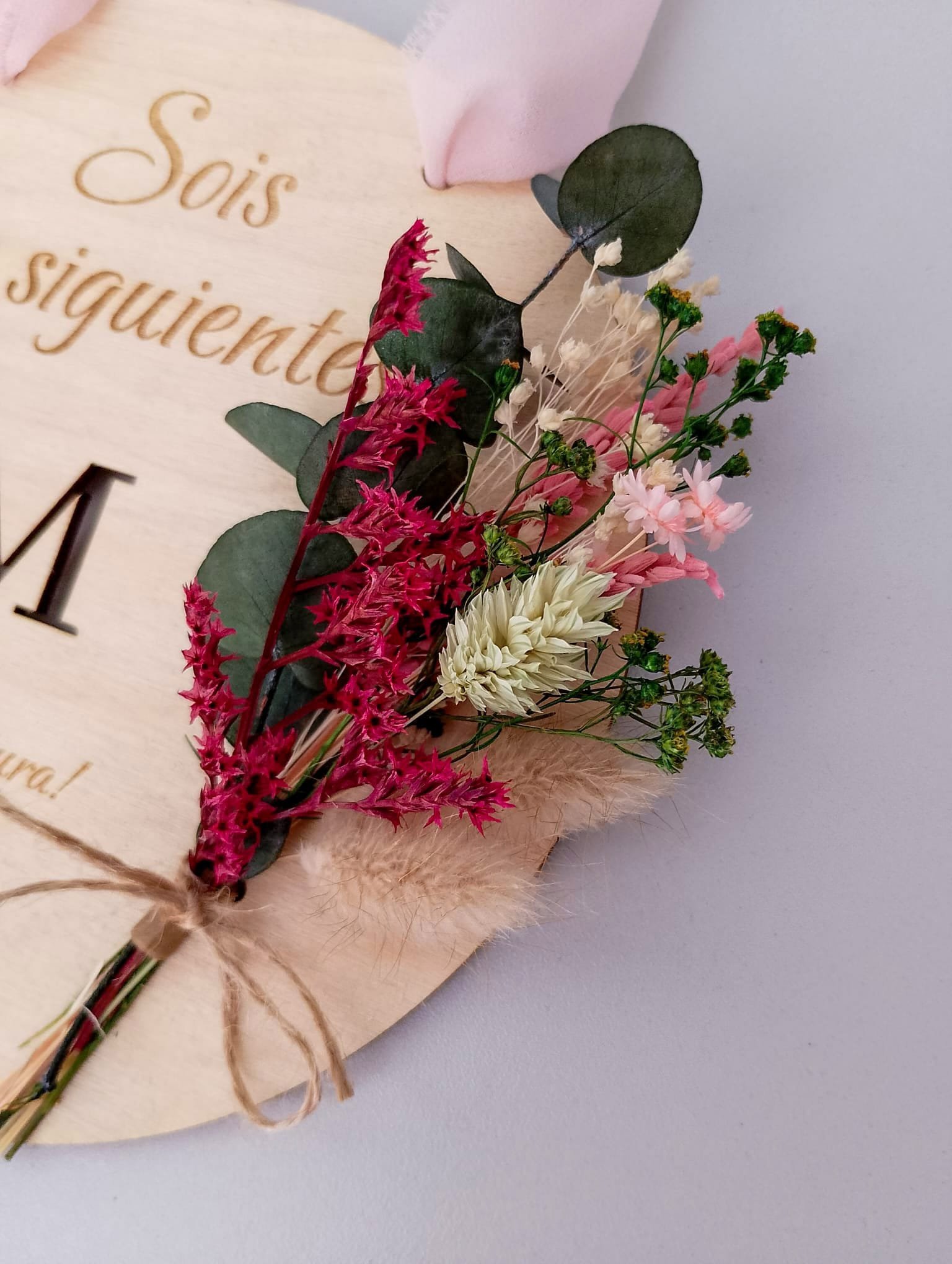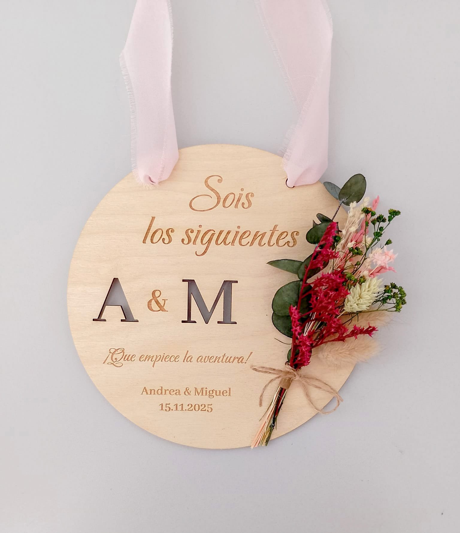 Celebra el amor y los nuevos comienzos con nuestra placa de madera natural “Sois los Siguientes” con flores preservadas. Un detalle artesanal, elegante y lleno de significado para regalar o decorar en bodas y compromisos.