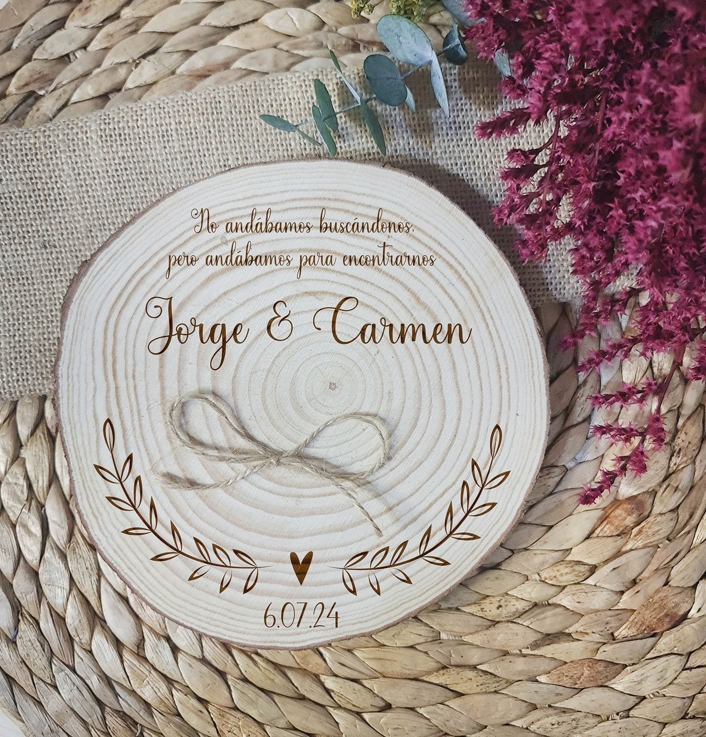 Dale un toque cálido y natural al momento más especial de la boda con este porta alianzas hecho a mano en una rodaja de madera. Personalizado con los nombres de los novios y la fecha de su gran día, este detalle es perfecto para hacer que el intercambio de alianzas sea aún más emotivo. La madera natural le da un encanto rústico que encaja a la perfección con bodas al aire libre o con un estilo boho.
