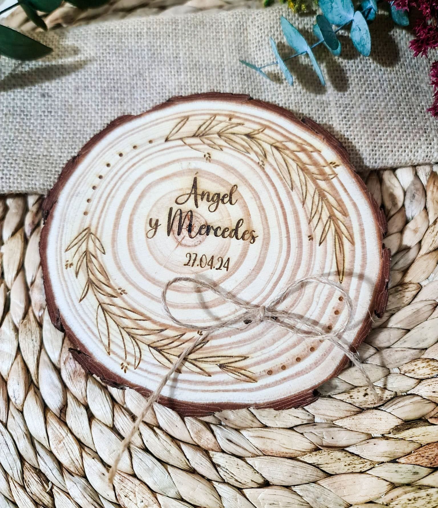 Dale un toque cálido y natural al momento más especial de la boda con este porta alianzas hecho a mano en una rodaja de madera. Personalizado con los nombres de los novios y la fecha de su gran día, este detalle es perfecto para hacer que el intercambio de alianzas sea aún más emotivo. La madera natural le da un encanto rústico que encaja a la perfección con bodas al aire libre o con un estilo boho.