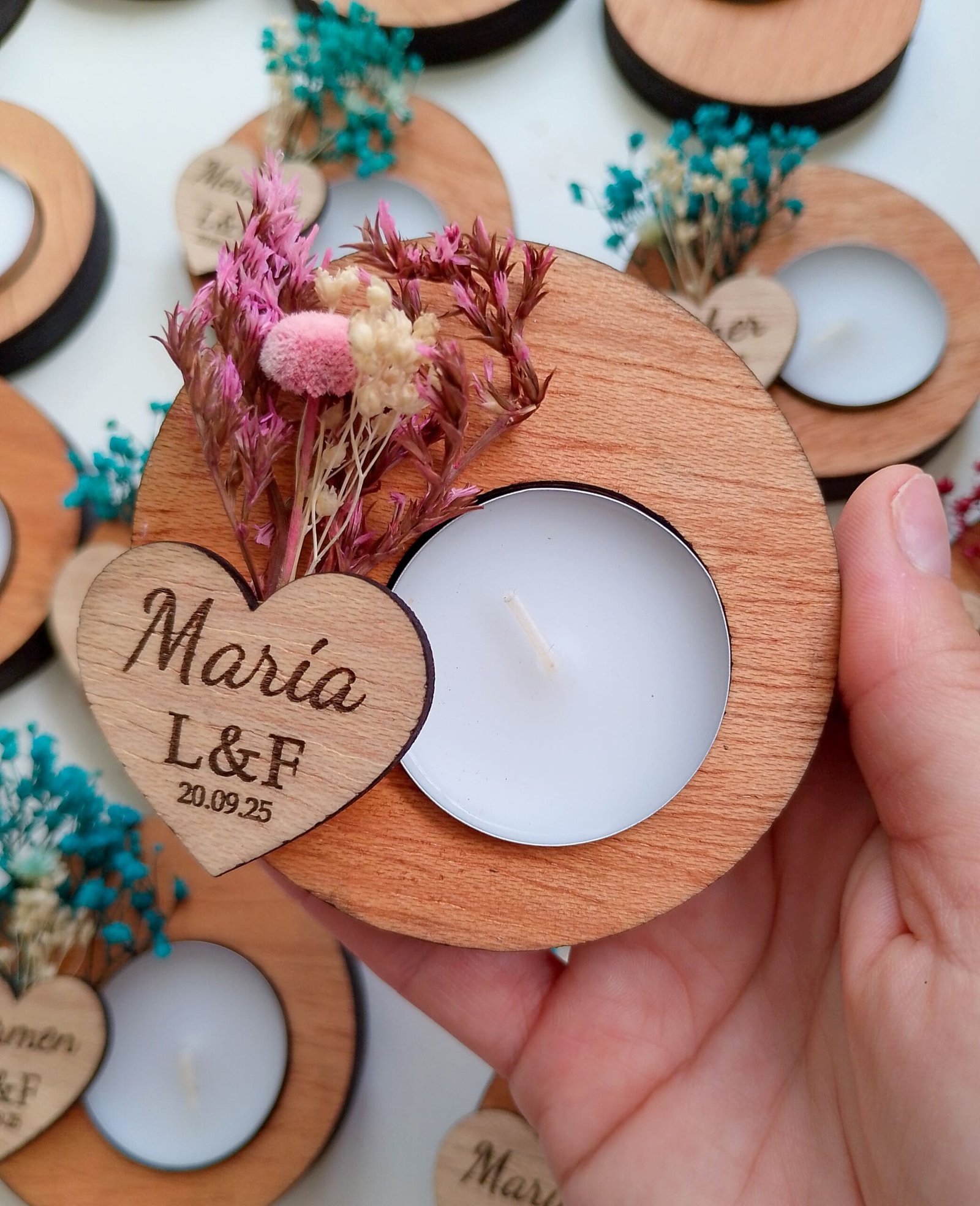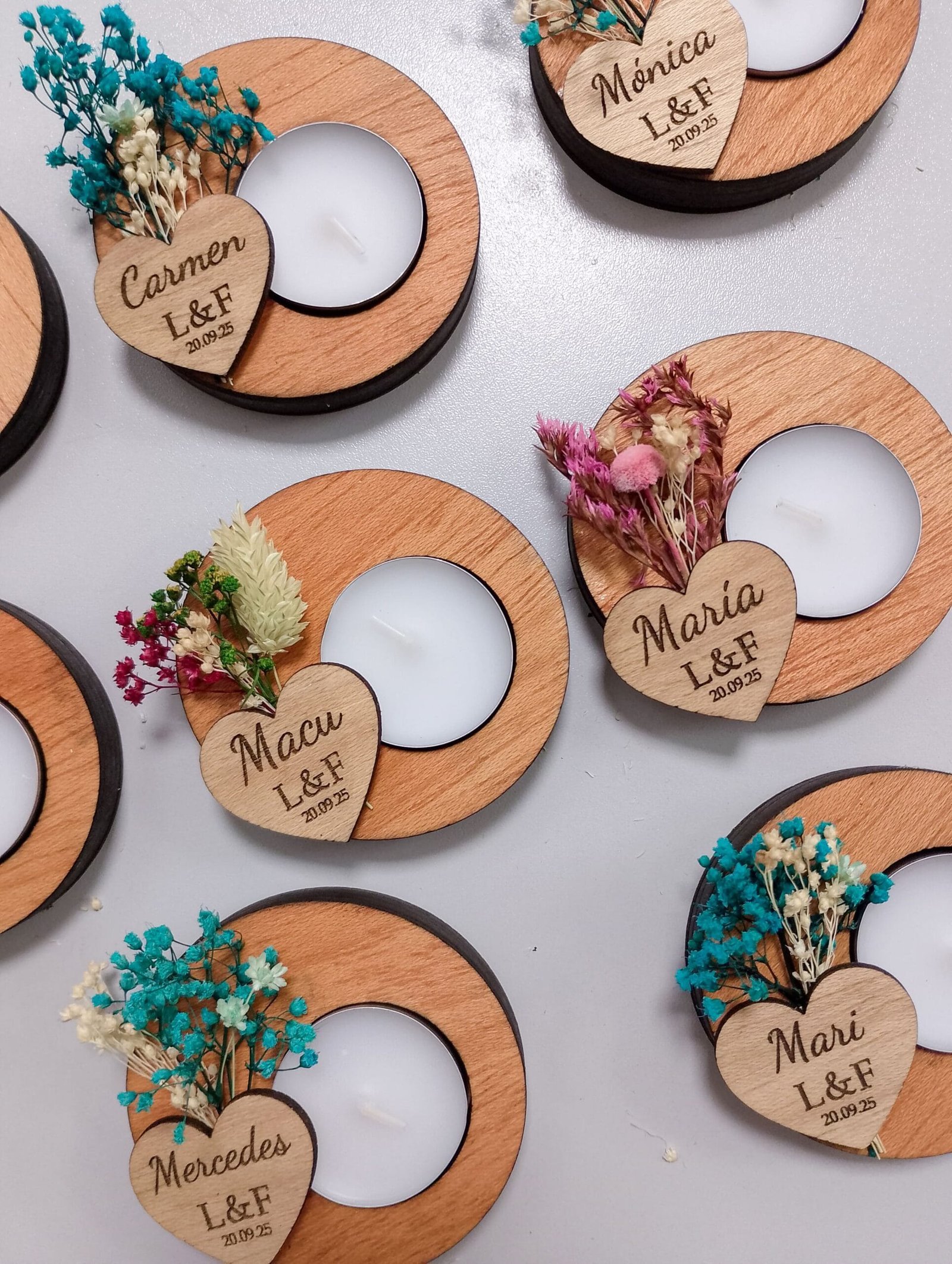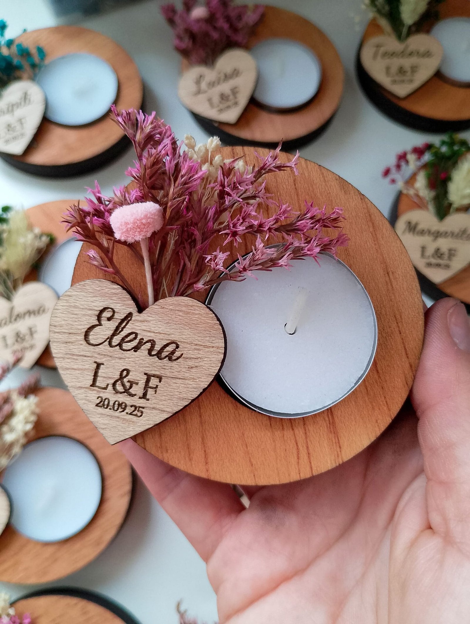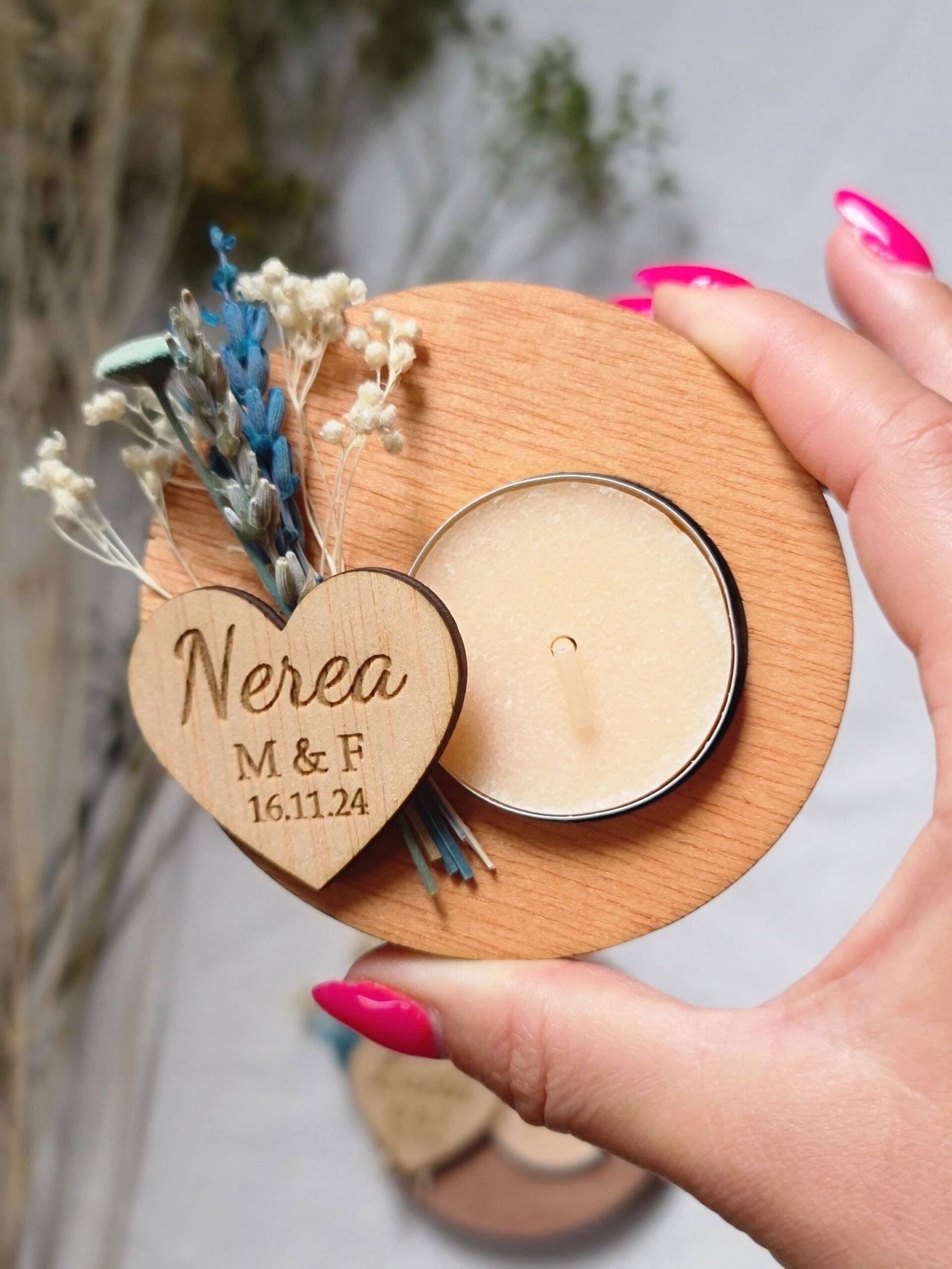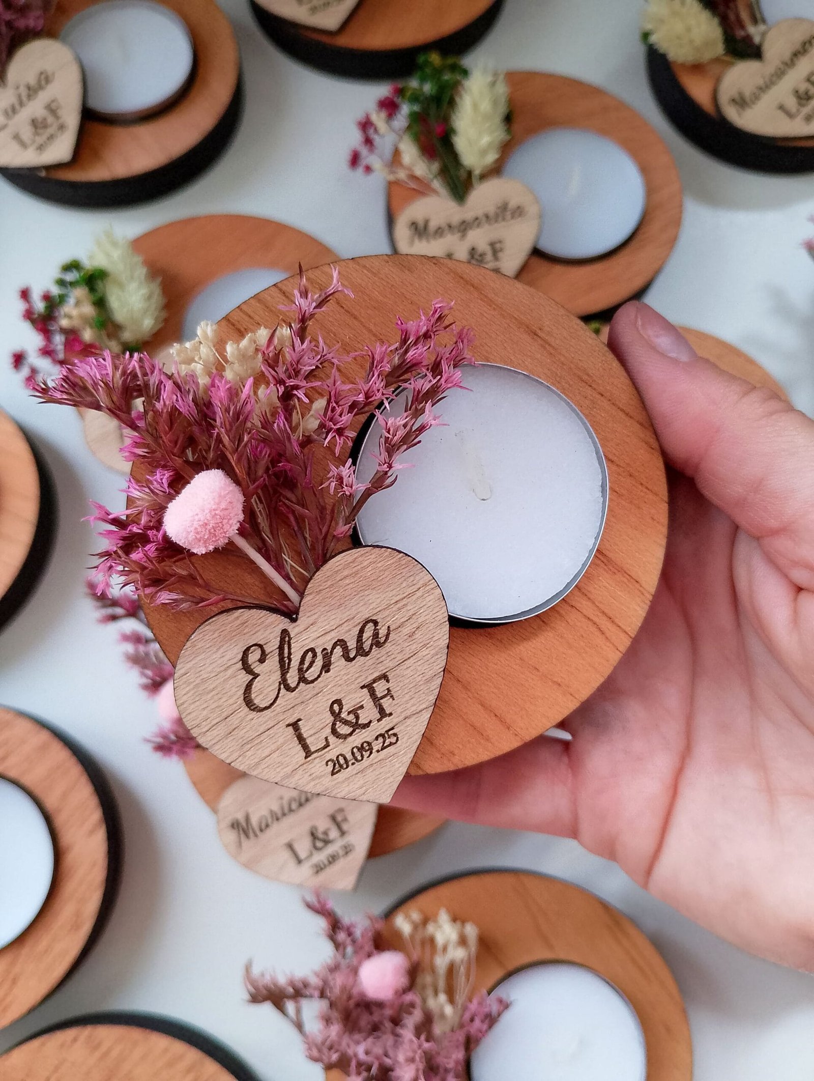 Nuestros portavelas de madera con flores preservadas, adornados con flores preservadas, es el complemento perfecto para tu boda. Un toque de naturaleza y amor para el día más especial. Personalízalos con los nombres de los novios y la fecha para un recuerdo inolvidable. Hacemos descuentos por cantidades. Pedido mínimo: 9 udsMateriales: