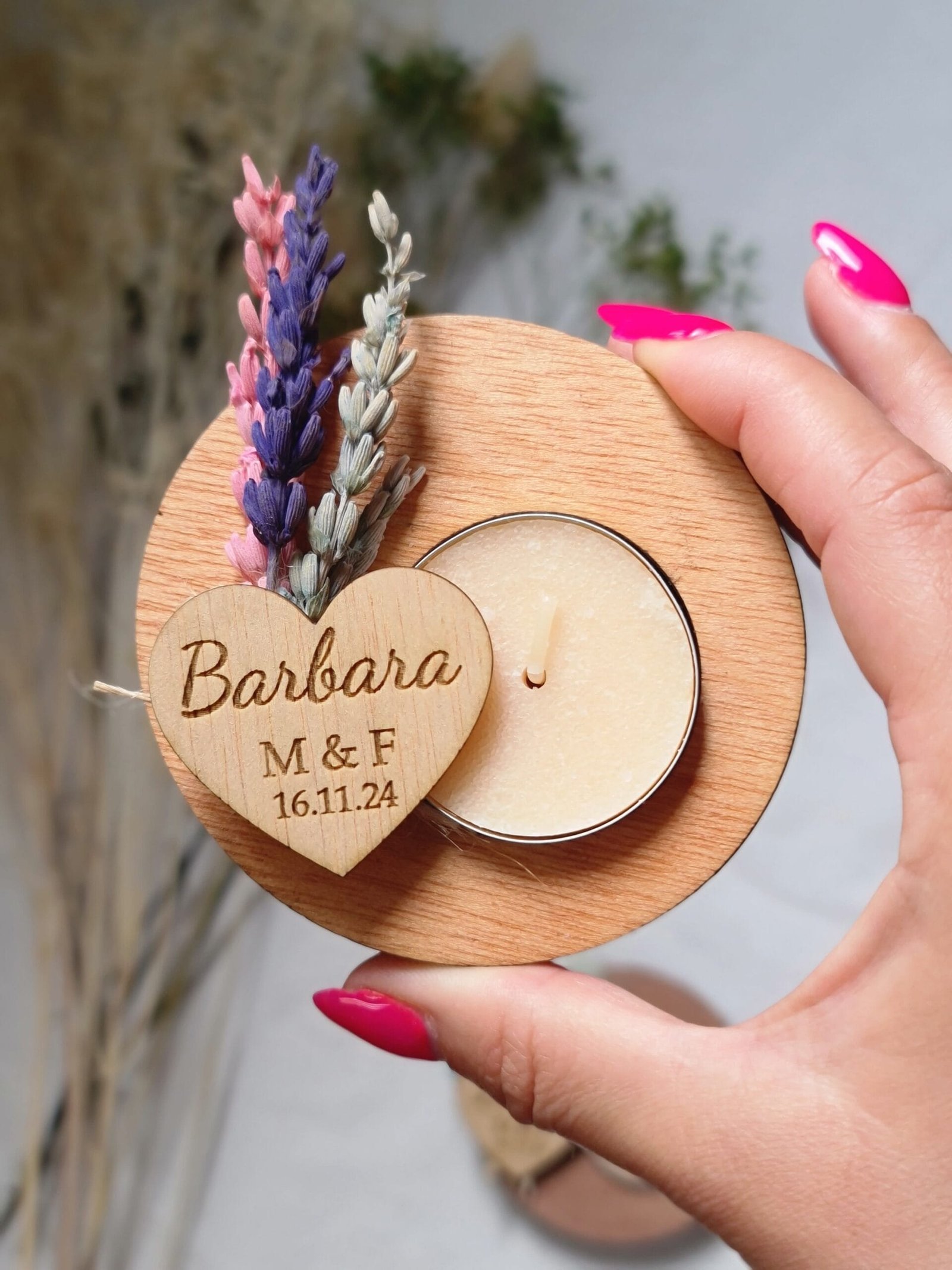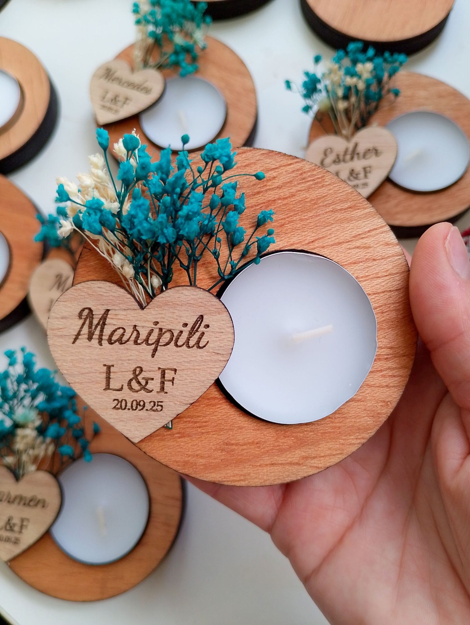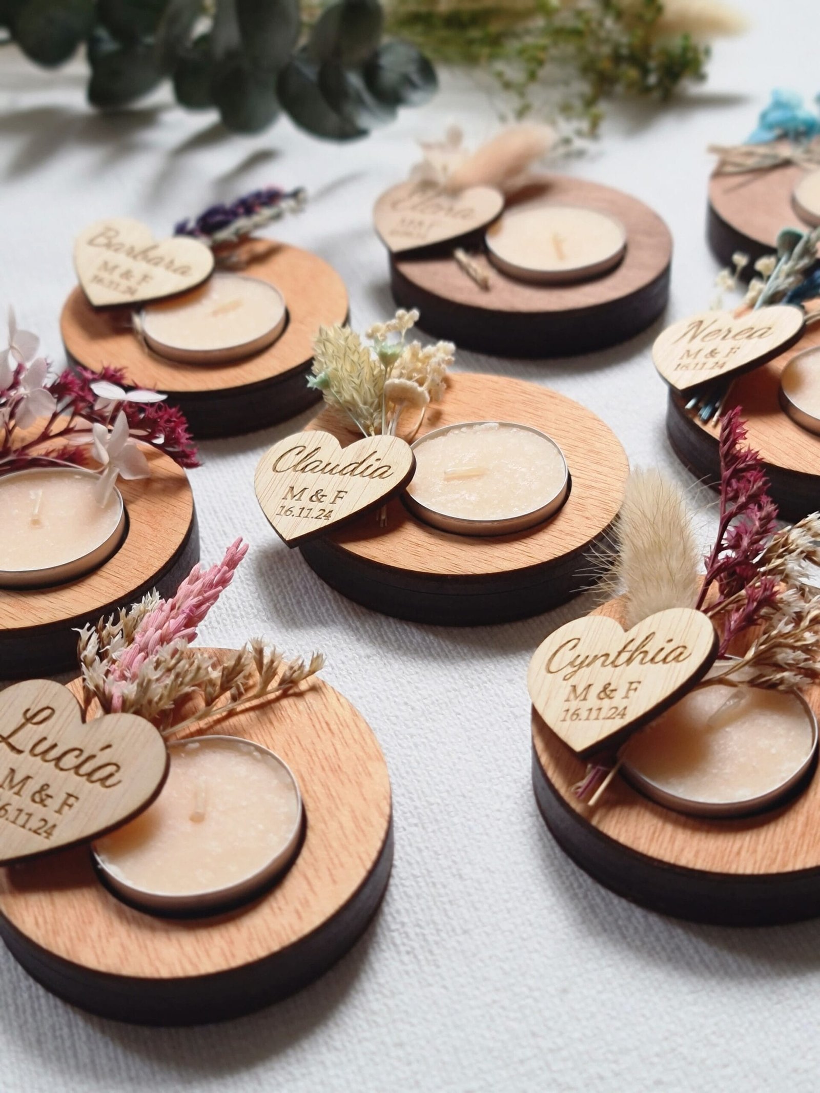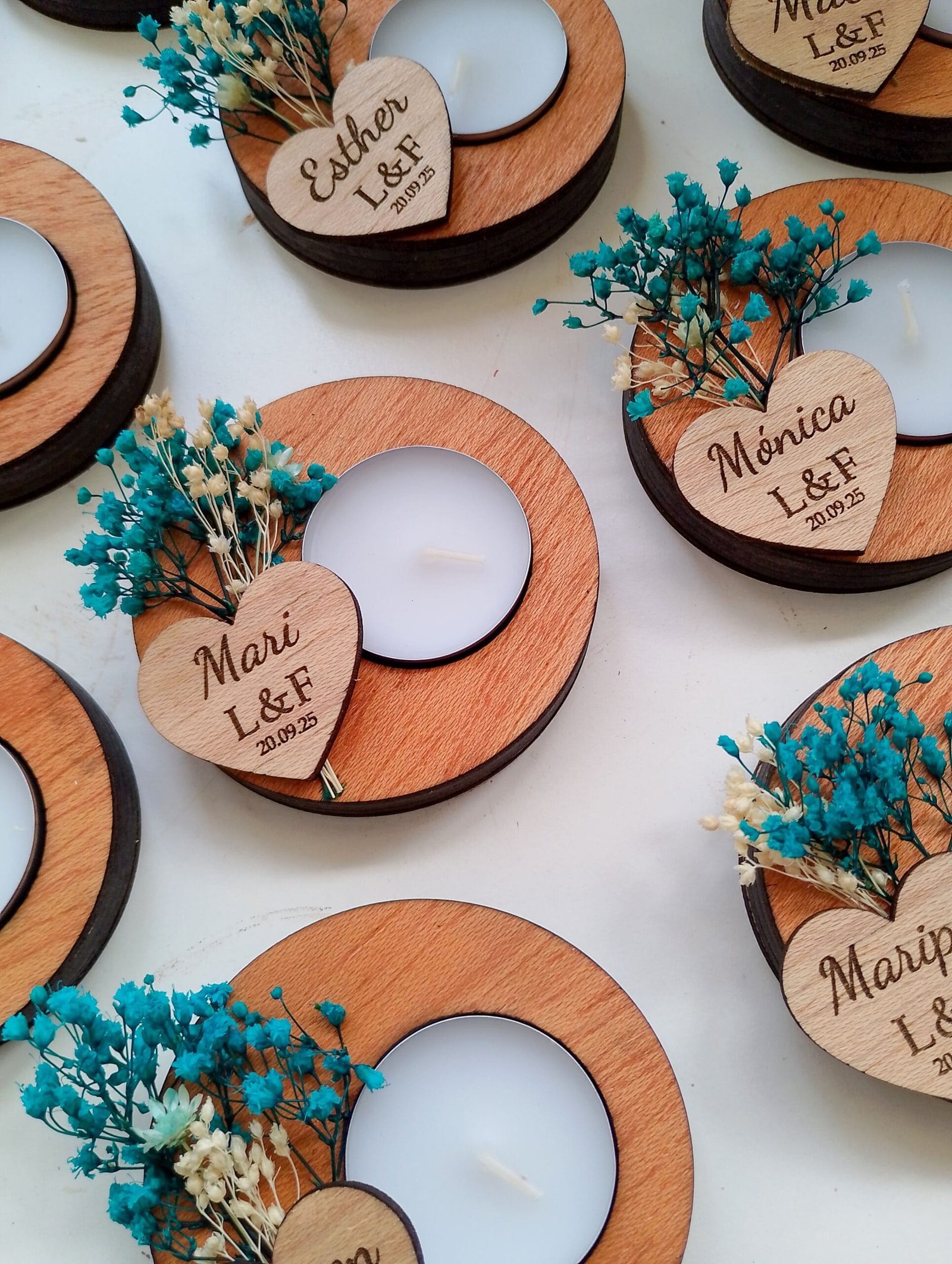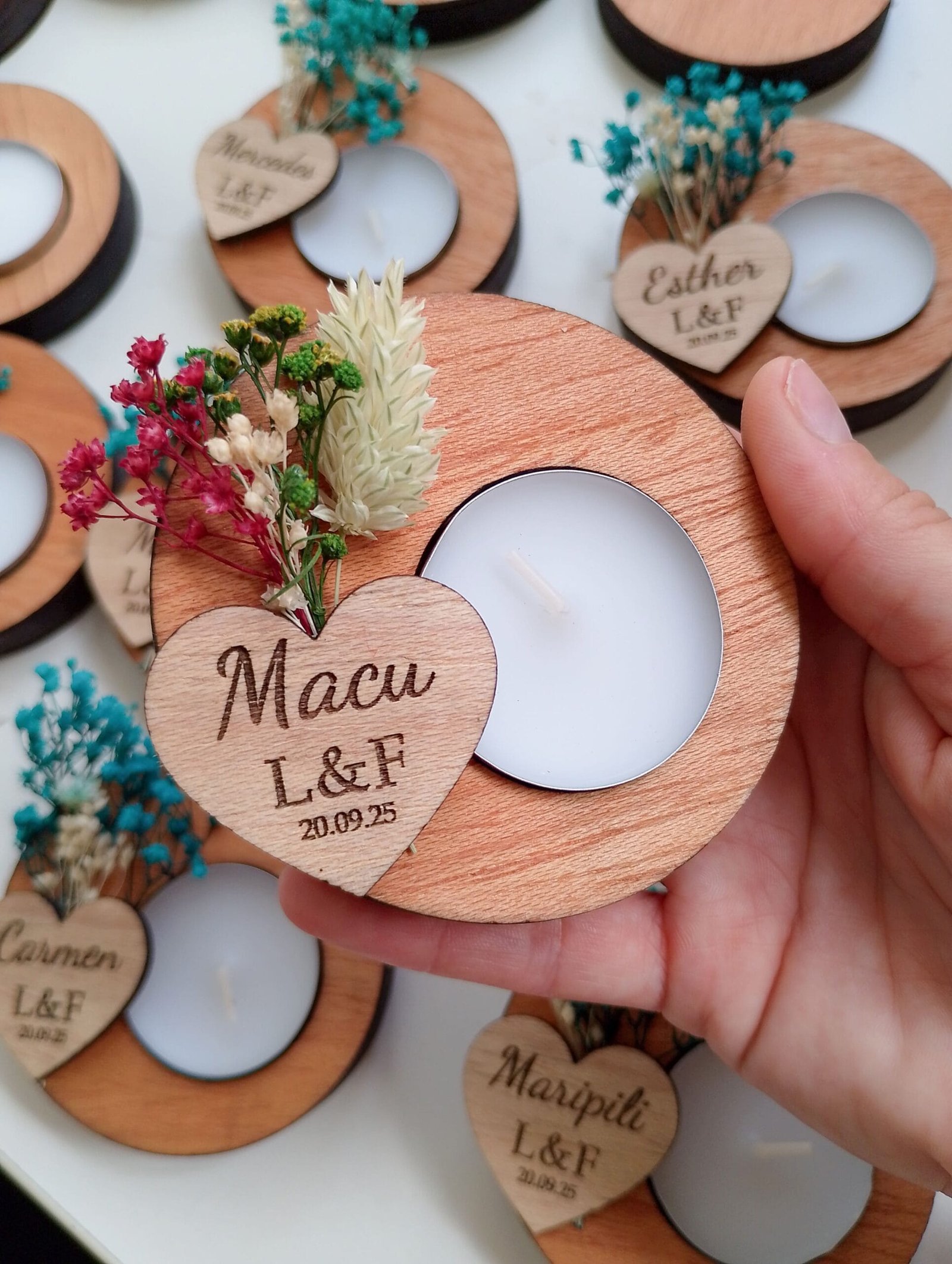 Nuestros portavelas de madera con flores preservadas, adornados con flores preservadas, es el complemento perfecto para tu boda. Un toque de naturaleza y amor para el día más especial. Personalízalos con los nombres de los novios y la fecha para un recuerdo inolvidable. Hacemos descuentos por cantidades. Pedido mínimo: 9 udsMateriales: