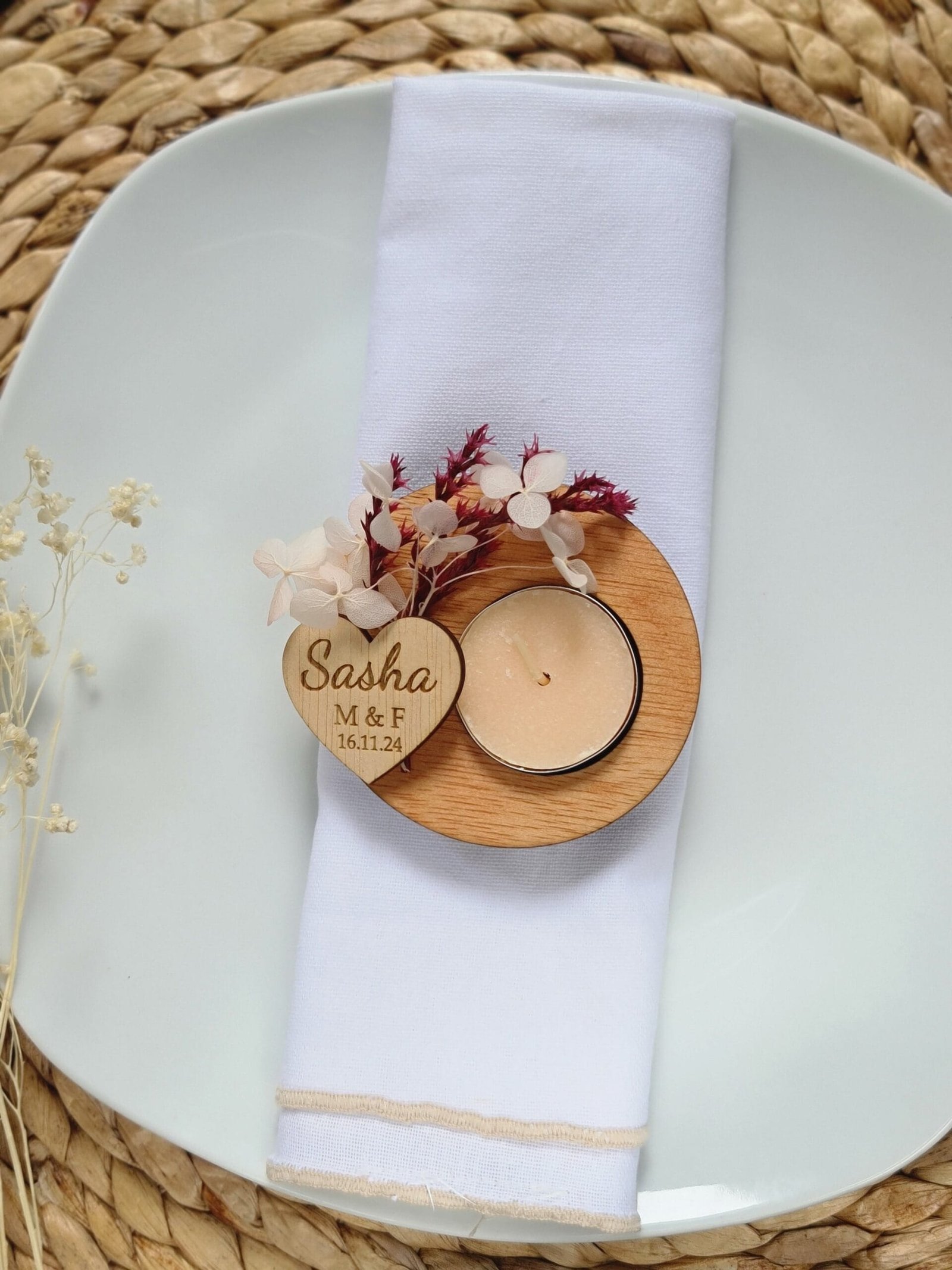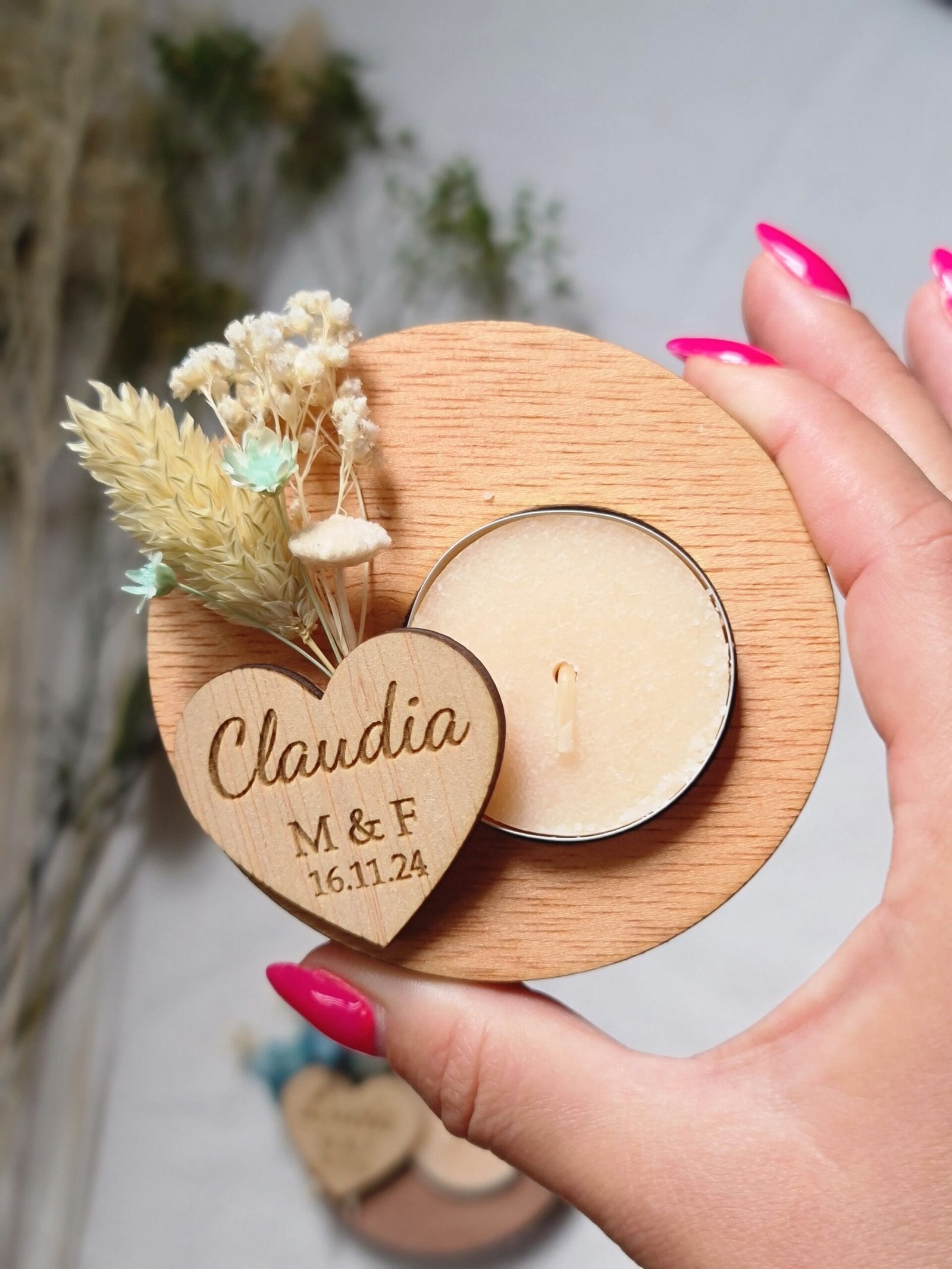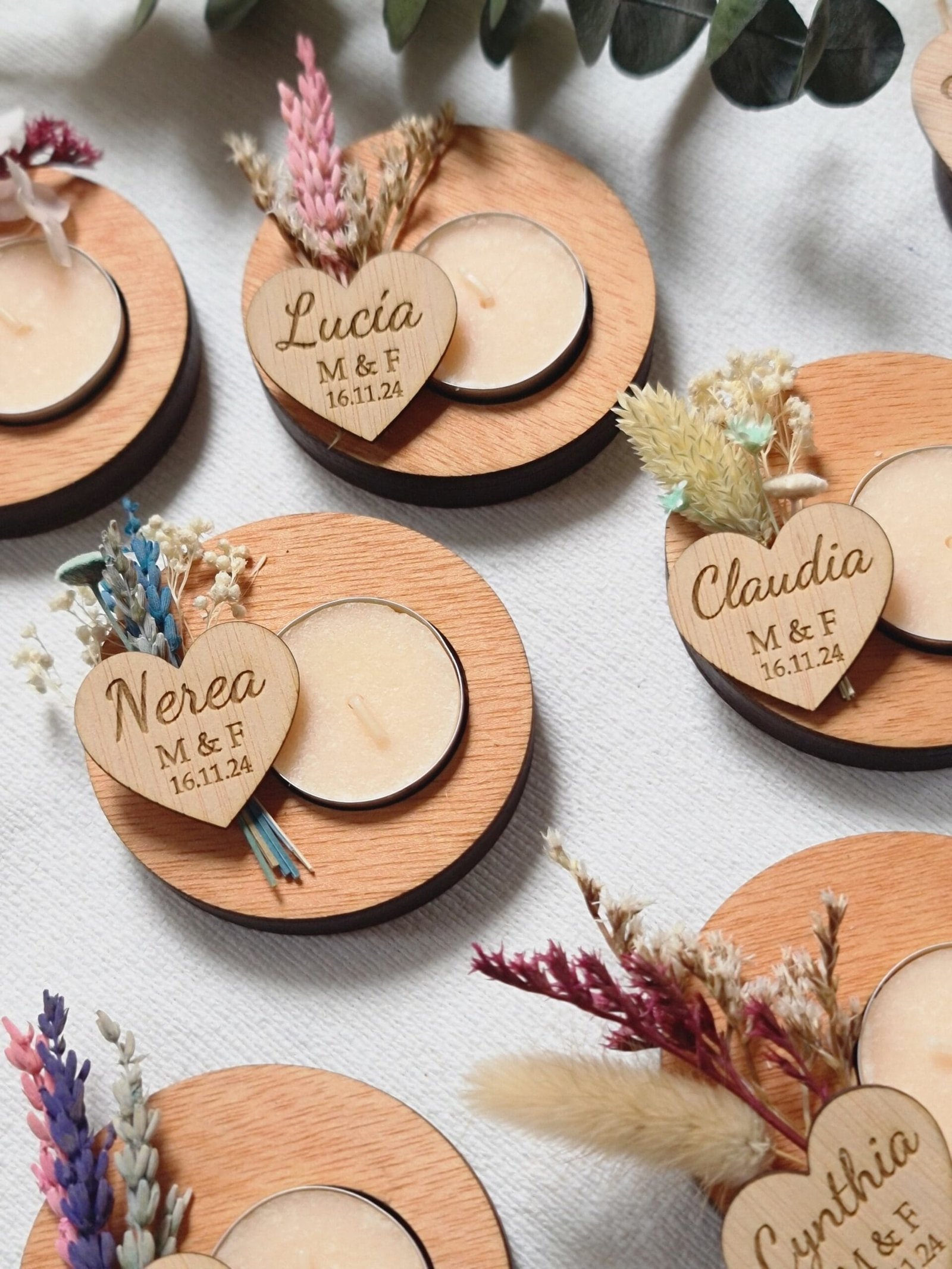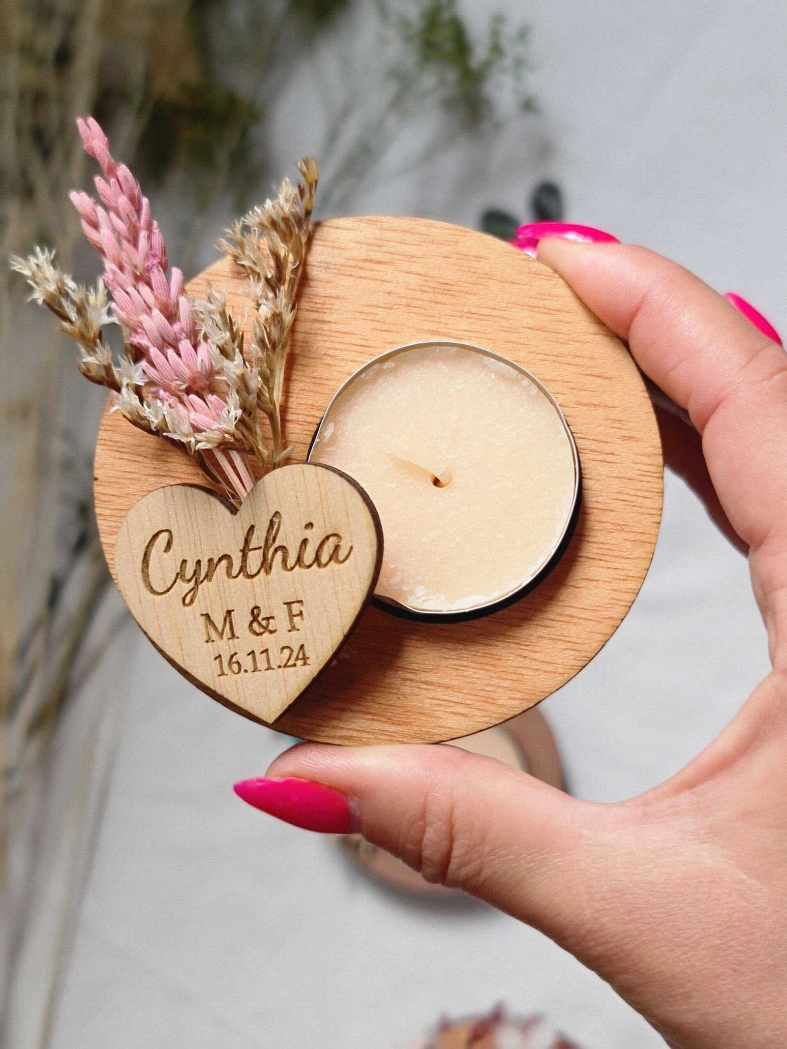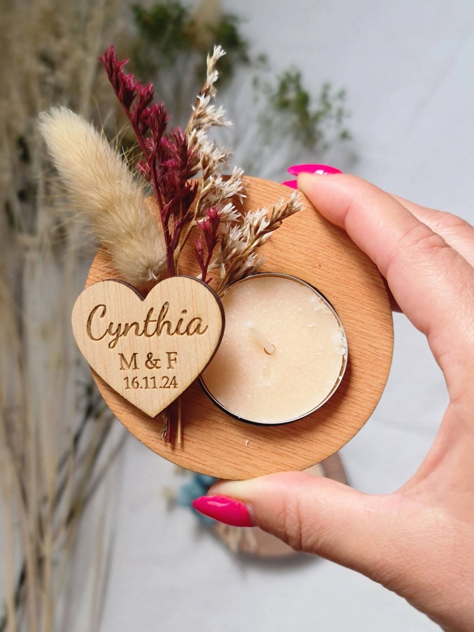 Nuestros portavelas de madera con flores preservadas, adornados con flores preservadas, es el complemento perfecto para tu boda. Un toque de naturaleza y amor para el día más especial. Personalízalos con los nombres de los novios y la fecha para un recuerdo inolvidable. Hacemos descuentos por cantidades. Pedido mínimo: 9 udsMateriales: