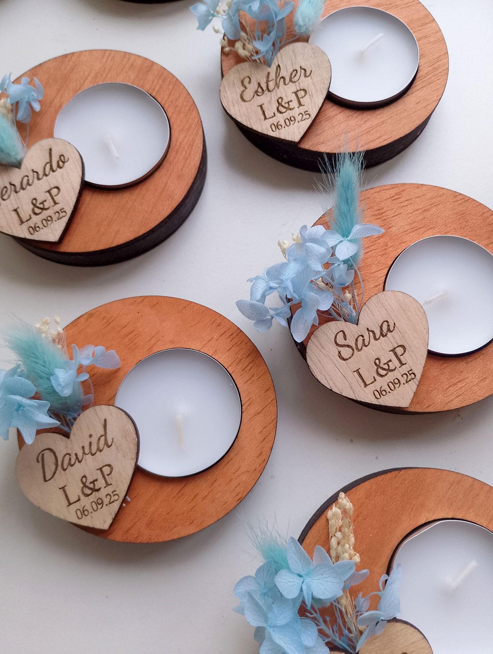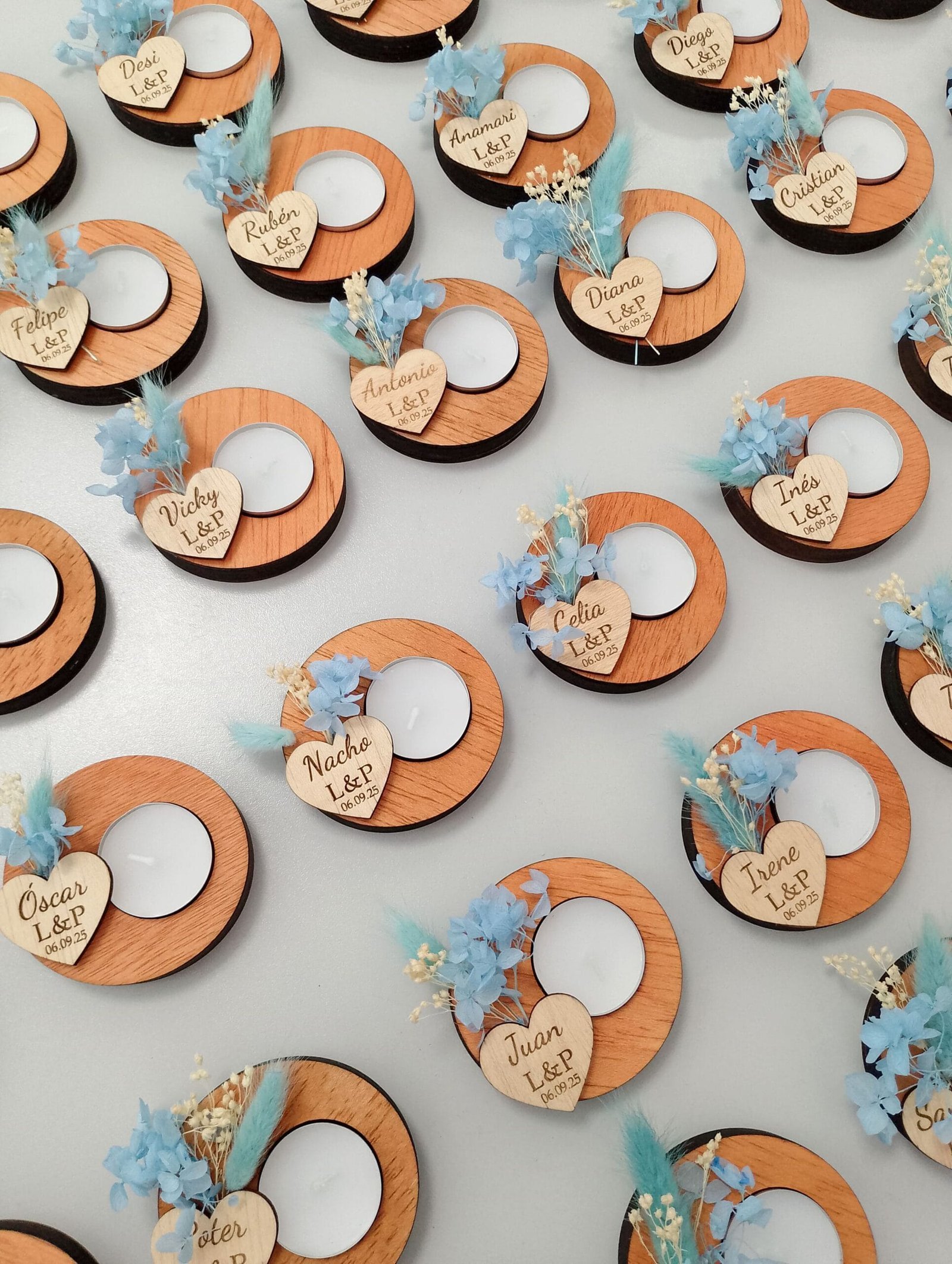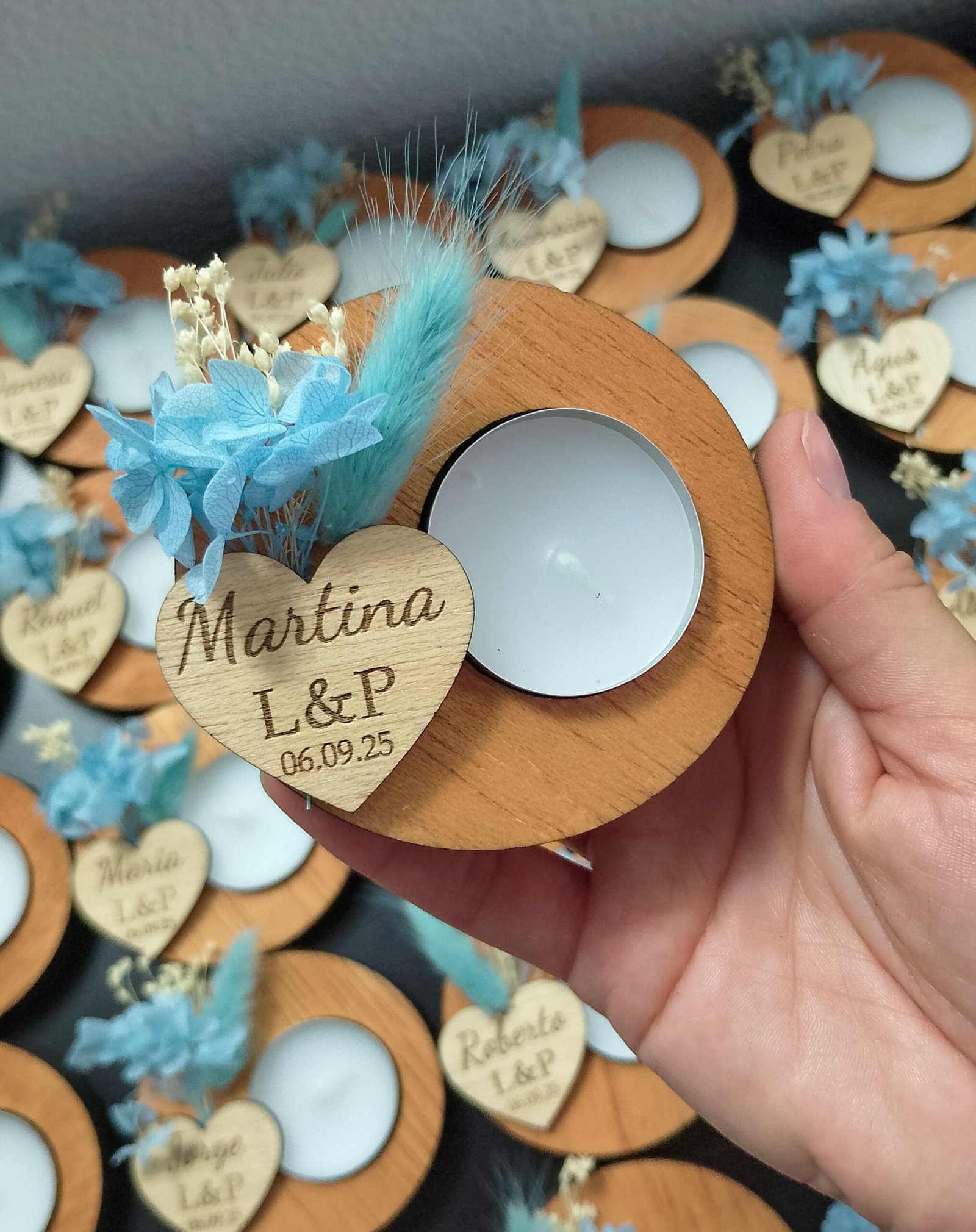 Todos nuestros portavelas están creados artesanalmente en nuestro taller en Alicante pieza por pieza. Es un regalo único hecho a mano que sorprenderá a cualquier persona de la fiesta ya que es un detalle muy tierno y también puede servir como marcasitios ya que cada portavelas lleva una etiqueta de madera con el nombre del invitado además de llevar los nombres de los novios y la fecha de la boda.